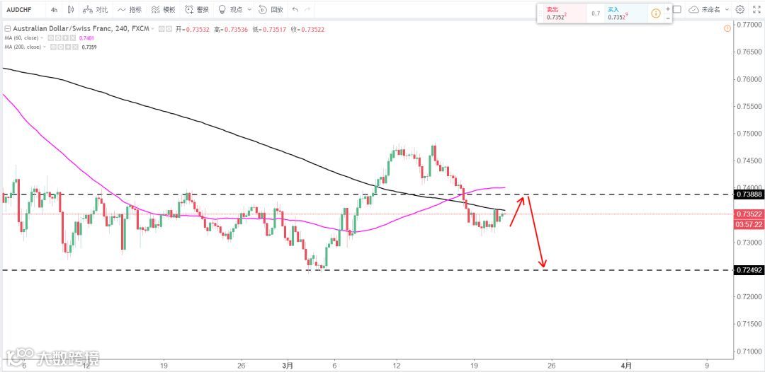 策略分析:底部区间震荡 ,大方向不明,上方压力0.7390区域,逢高布局空单看二次探底。
