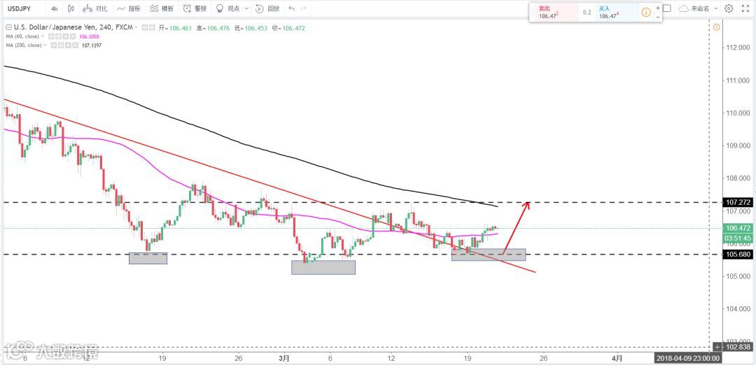 策略分析:中期下降趋势线已突破, 三重底初现,原则上逢低做多,下方支撑106区域。策略:106区域布局多单 ,目标看向107.3区域。(谨慎操作,请设置好止损线!)