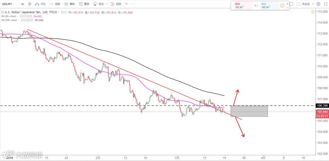 策略分析:4H 级别并未完全突破下降趋势线,短线方向不明,走势并未随着美元指数走强以及黄金走弱而走强,低位震荡,等待突破106.4有效后在做布局。