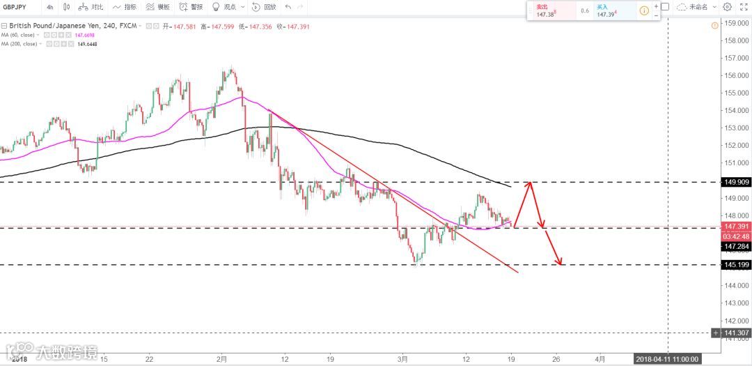 策略分析: 关注下方支撑147.3区域能否有效支撑,大区间150-145区域。直盘强弱不明导致英镑日元短线走势不明朗。