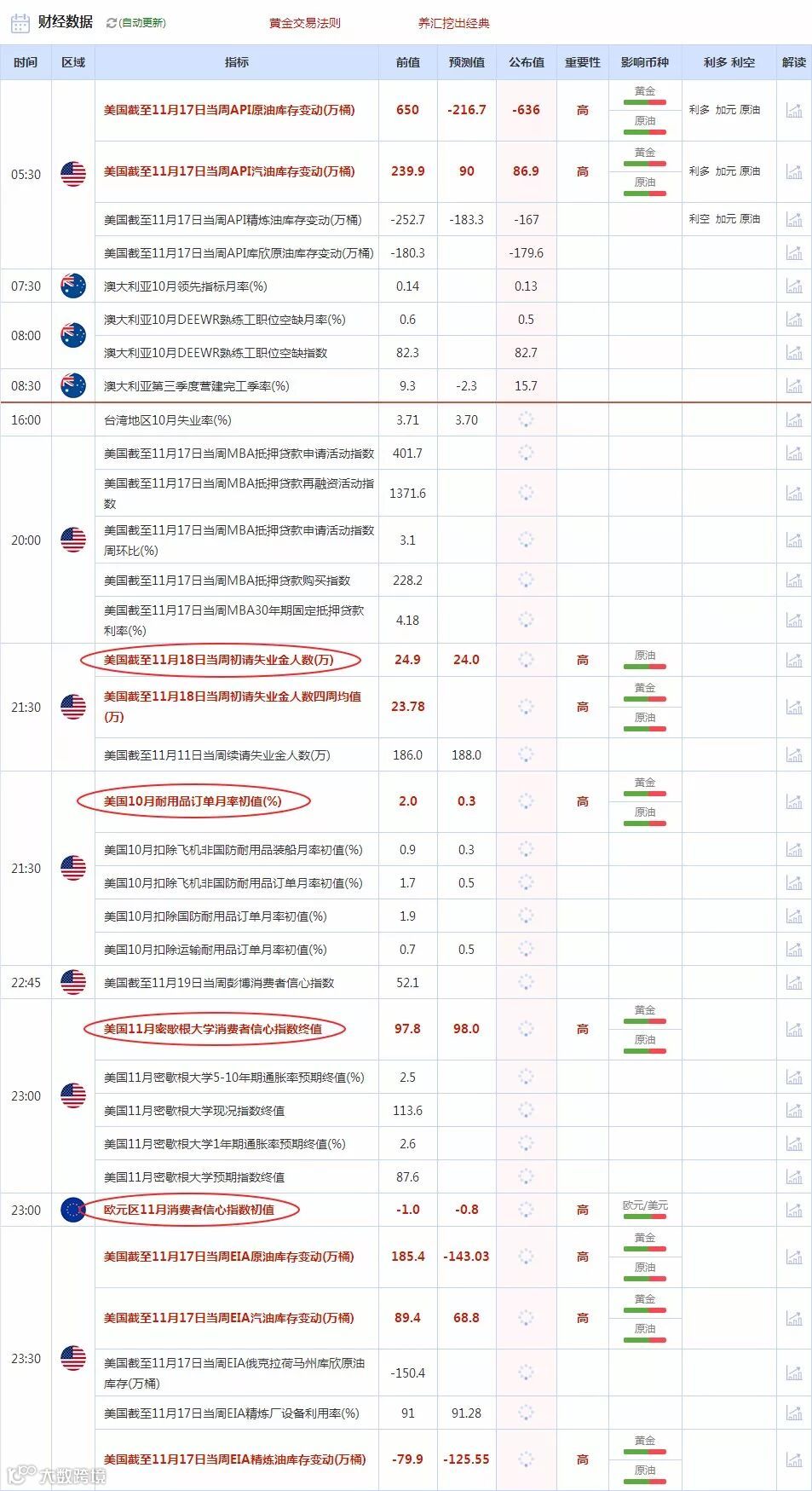 美国时段,投资者需关注21:30公布的美国10月耐用品订单月率初值、美国截至11月18日当周初请失业金人数。此后,投资者还需关注23:00公布的美国11月密歇根大学消费者信心指数终值、欧元区11月消费者信心指数初值。