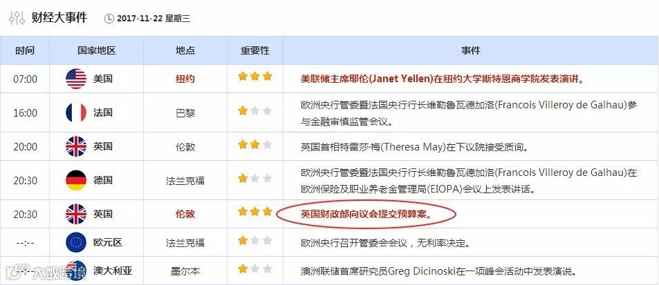 周三(11月22日)欧洲时段,投资者需关注20:30公布的英国财政部向议会提交预算案。