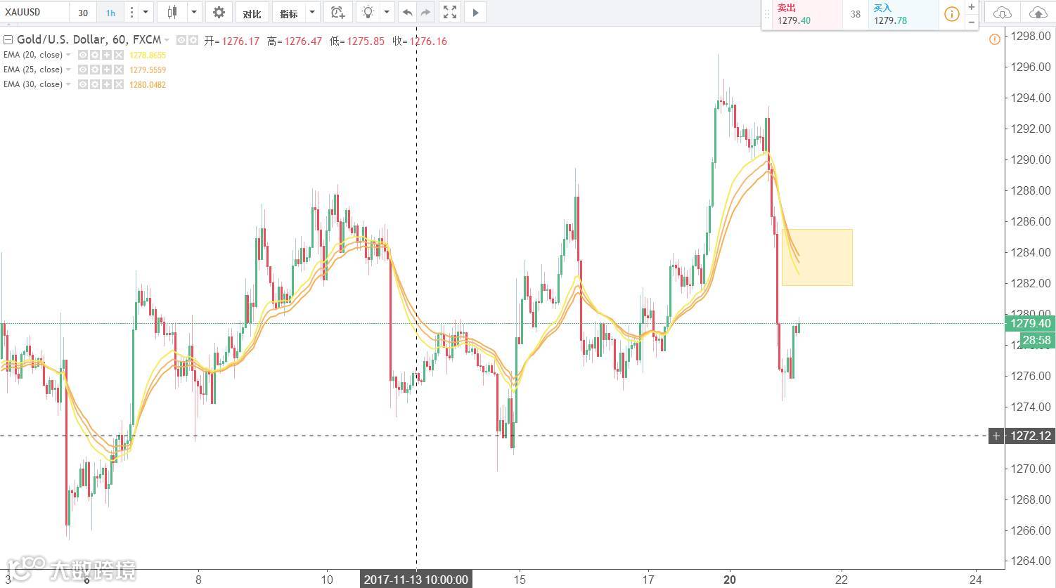 策略一:1小时,低点上移,高点上移,今日A4的位置在1272附近,30分钟在此收出看涨吞没形态做多,止损形态之外加1美金,持仓暂定为3小时。(谨慎操作,请设置好止损线!)