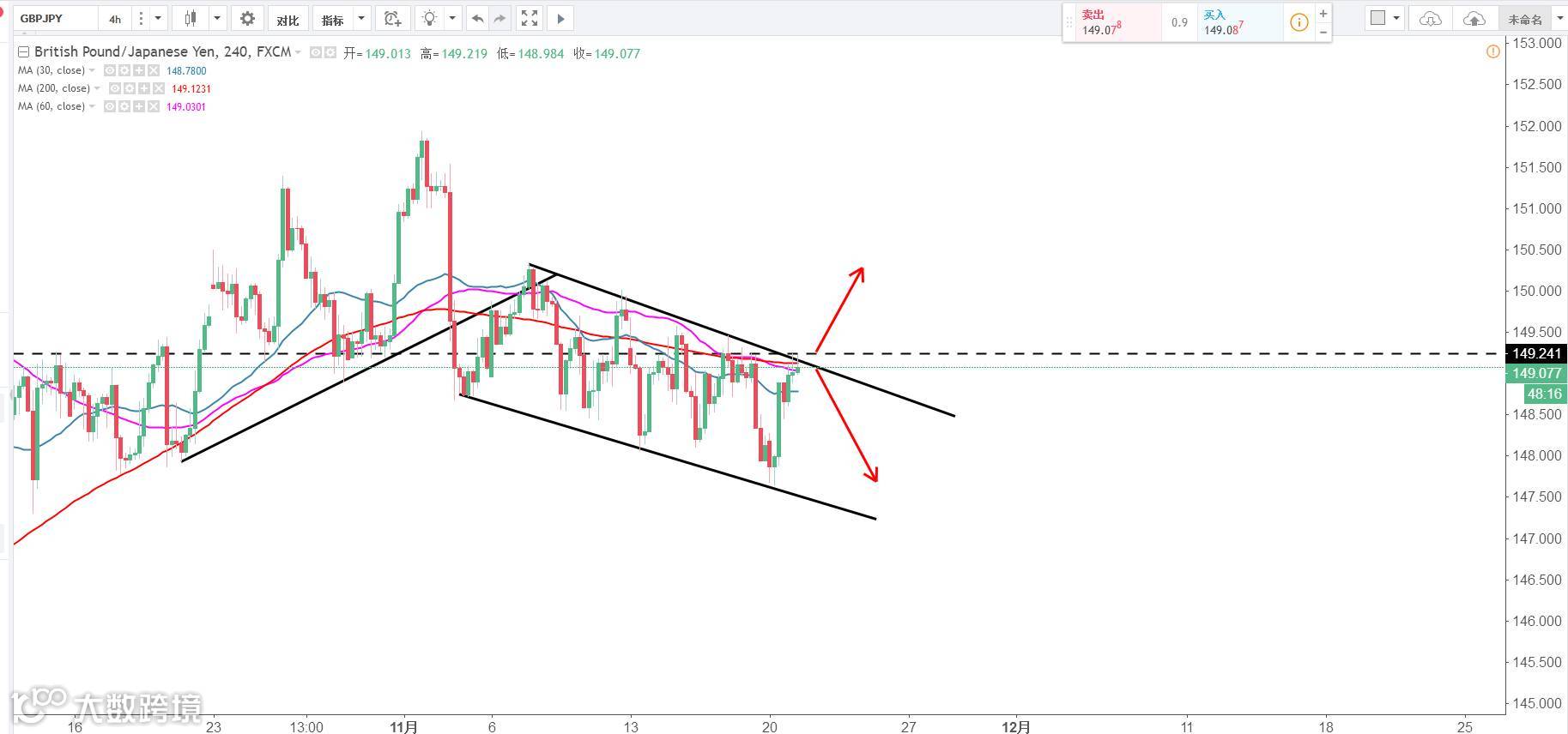 技术点评:4H级别处在一条比较标准但乖离率很小的下降通道当中,149.3作为多空分水岭,上方看多下方看空。