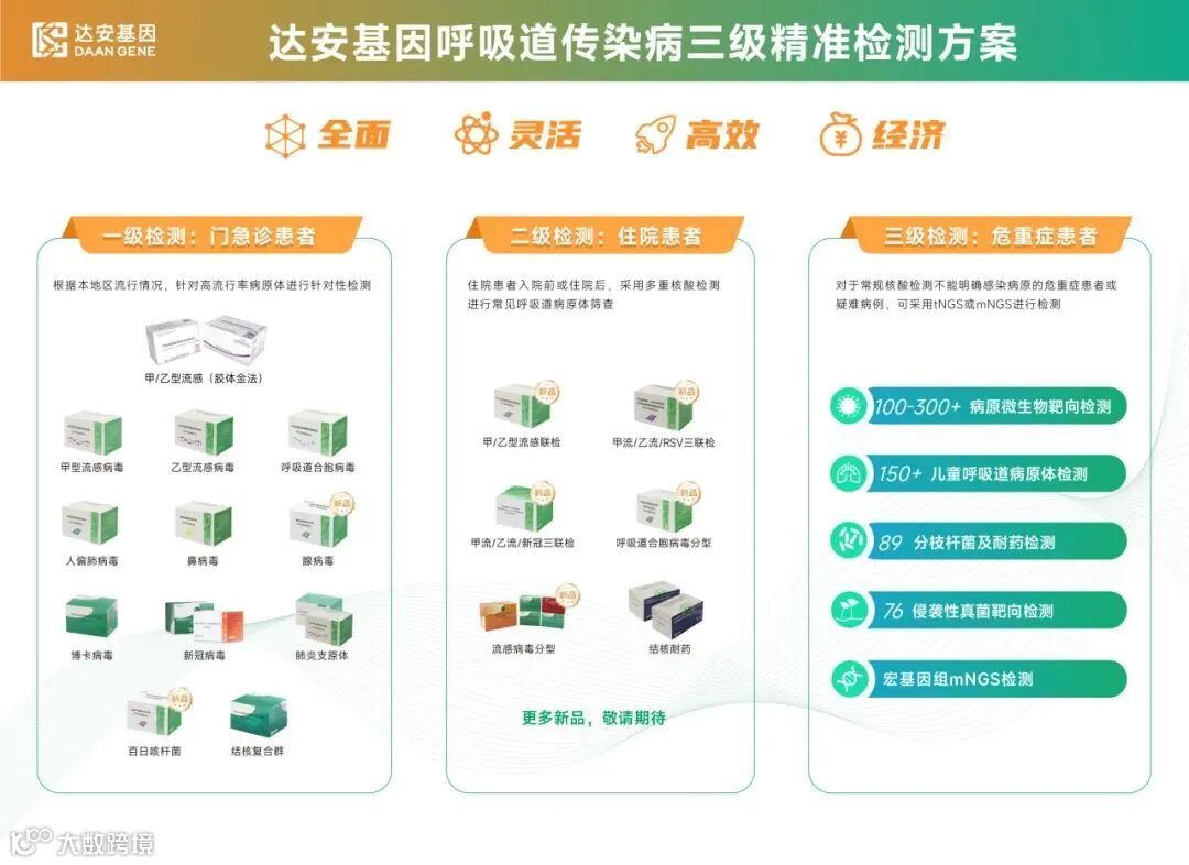 达安基因推出了更贴合临床诊疗需求的呼吸道传染病三级精准检测方案:对于门急诊患者,选择高流行率病原体进行针对性检测;对于住院患者,采用多重核酸检测对常见病原体进行筛查;对于常规核酸检测不能明确病因的危重症或疑难杂症患者,采用病原NGS进行检测。该方案通过构建立体化的分级精准检测模式,可提升医疗机构的疾病精准诊疗水平。