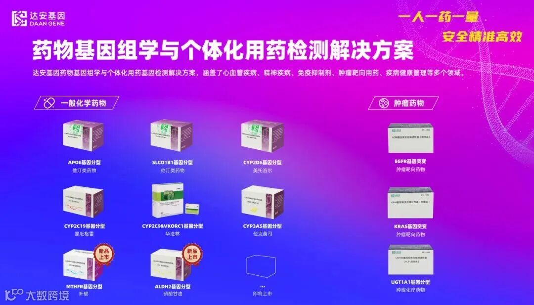 药物基因检测添新丁:获批的MTHFR基因分型检测试剂(国械注准20253401571),可评估叶酸代谢能力,精准分析心脑血管疾病及不良妊娠风险,为个体化叶酸补充提供“基因级指导”;ALDH2基因分型检测试剂(国械注准20253402003)可以指导硝酸甘油的个体化用药,评估个体酒精代谢能力。达安基因在药物基因学与个体化用药检测方案持续完善。