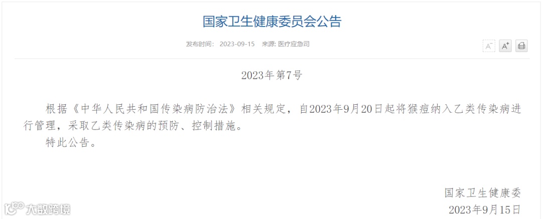 我国自2023年9月20日起,将猴痘纳入乙类传染病进行管理。