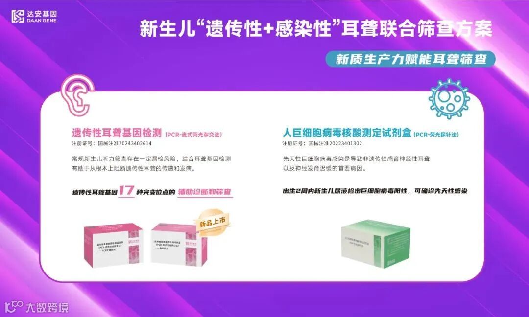 达安基因最新上市的“遗传性耳聋基因检测试剂盒(PCR-流式荧光杂交法)”是国内第二款获批的可用于遗传性耳聋基因“辅助诊断+筛查”用途的试剂盒,联合“人巨细胞病毒核酸测定试剂盒(PCR-荧光探针法)”可对新生儿进行覆盖“遗传性+感染性”因素的耳聋筛查,助力耳聋的早发现、早诊断、早干预及早预警。