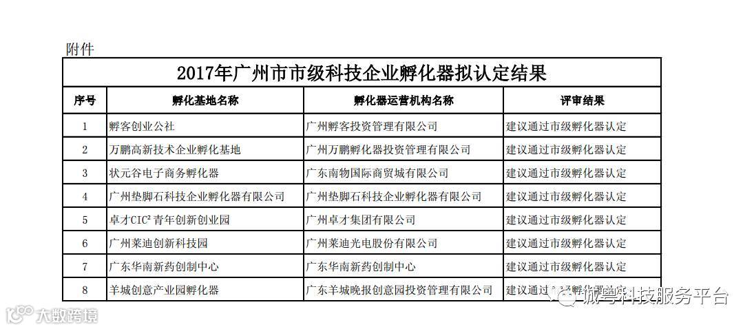 2017年广州市市级科技企业孵化器拟认定结果公示