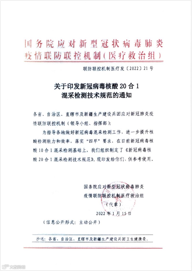 全员核酸筛查是遏制疫情扩散蔓延的重要手段,针对奥密克戎变异株疫情特点,2022年1月15日,国务院应对新冠肺炎疫情联防联控机制医疗救治组印发《新冠病毒核酸20合1混采检测技术规范》,进一步提升核酸检测能力和效率。