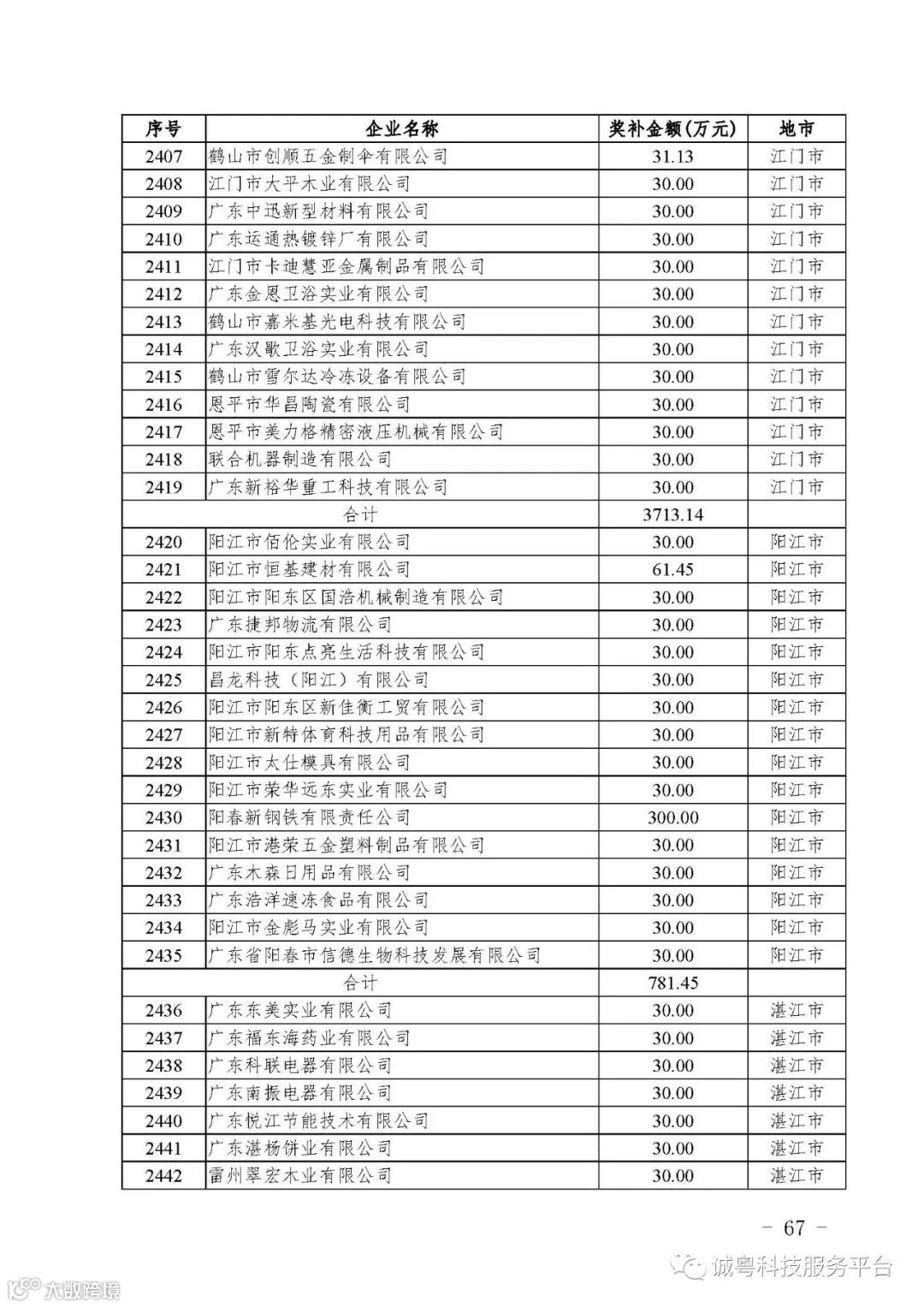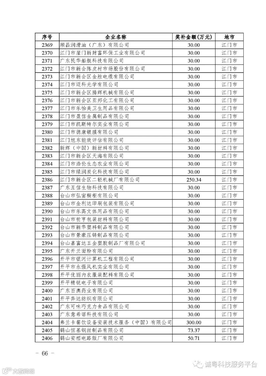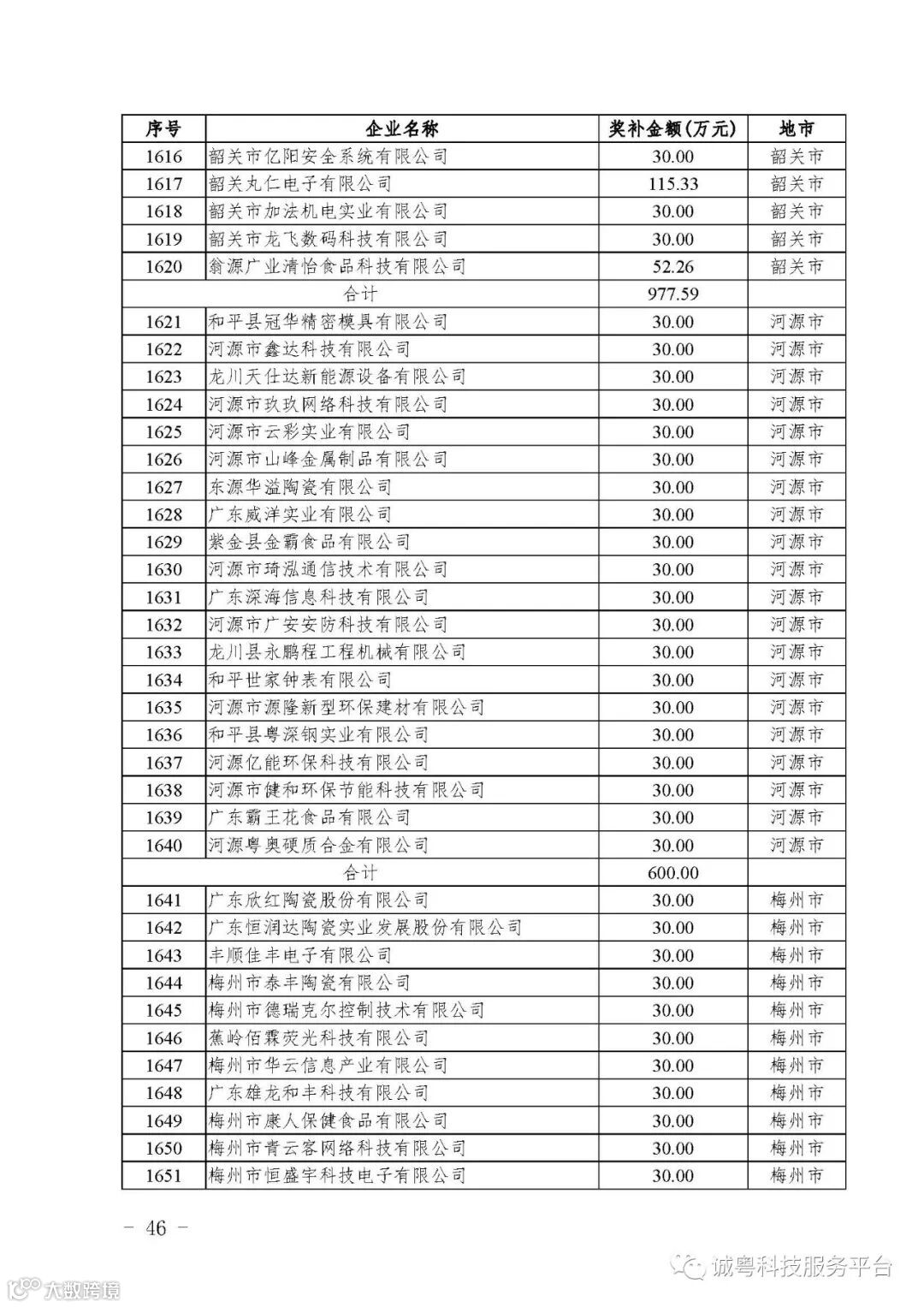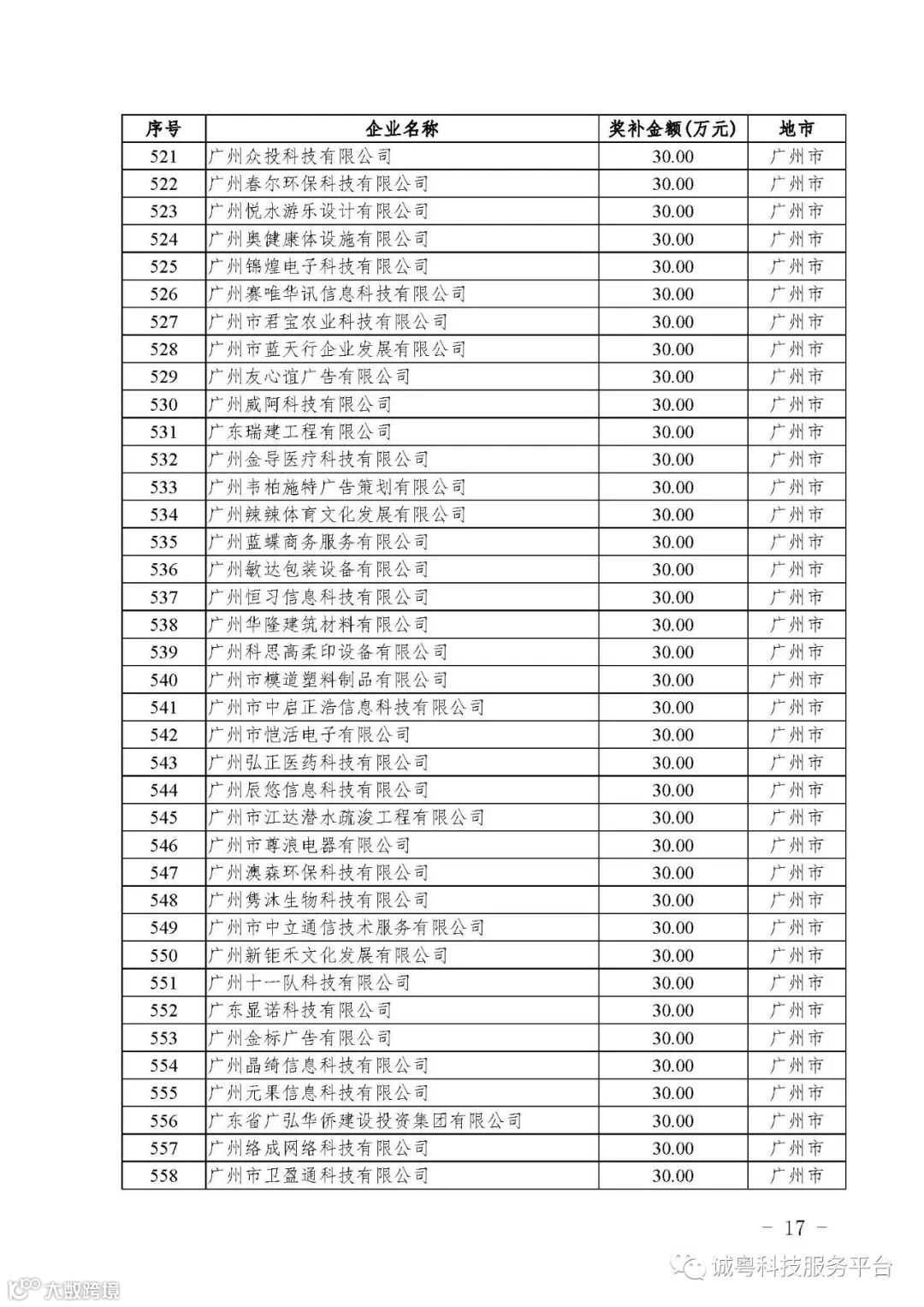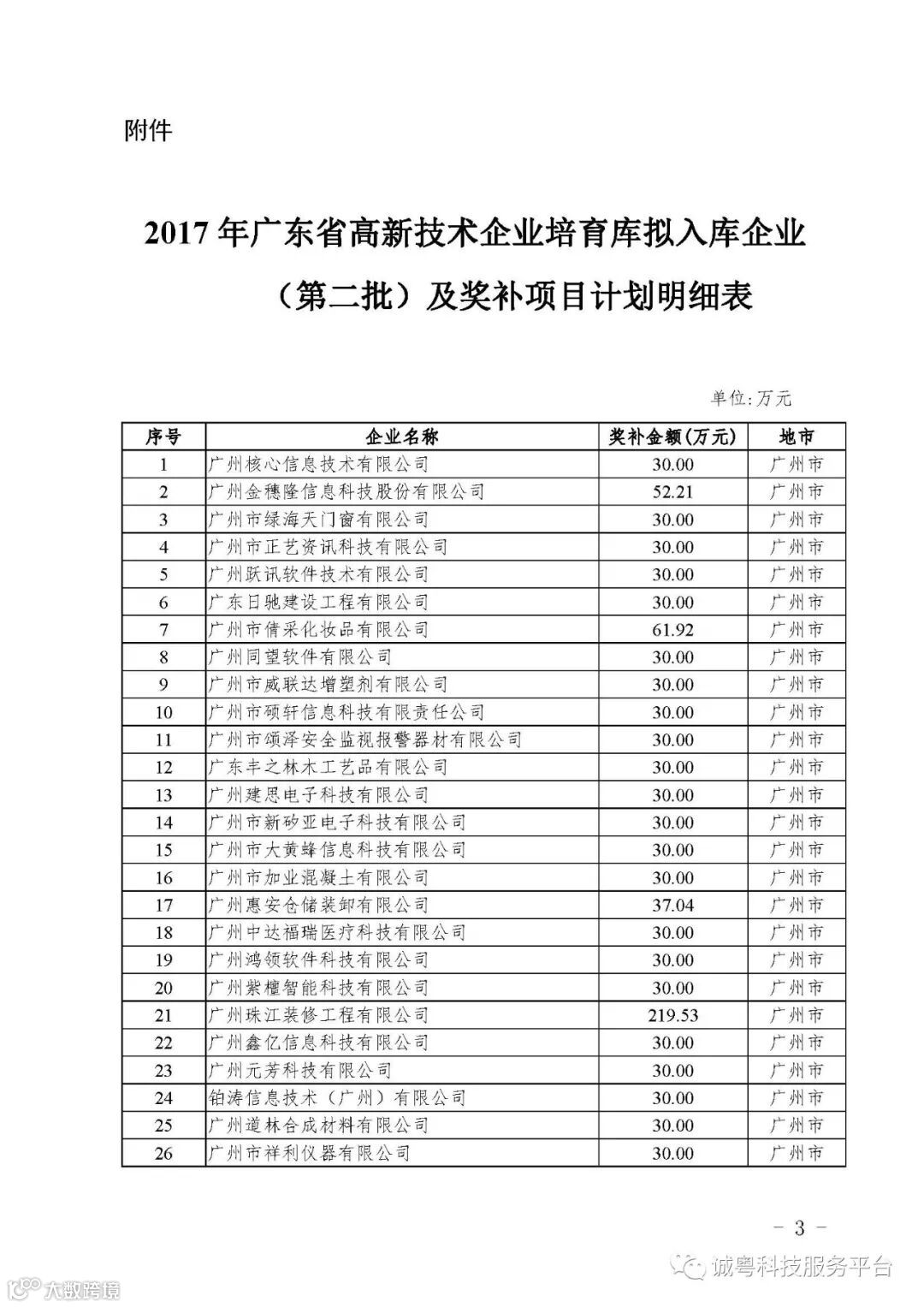 各有关单位: 根据《广东省高新技术企业培育工作实施细则》(粤科函高字〔2016〕1737号)的有关规定,经企业申报、专家评审、各地市培育机构核对奖补金额等程序,现对广州核心信息技术有限公司等2556家拟进入广东省2017年高新技术企业培育库的企业及奖补金额予以公示,公示期为5月2日-8日共7天。 如果对公示的拟入库培育企业及奖补金额有异议,请提供详细的事实证据,并于公示期内以实名、书面形式向省科技厅报告。对收到的异议,我们将严格按照相关规定处理。 附件:2017年广东省高新技术企业培育库拟入库企业(第二批)及奖补项目计划明细表 省科技厅 |