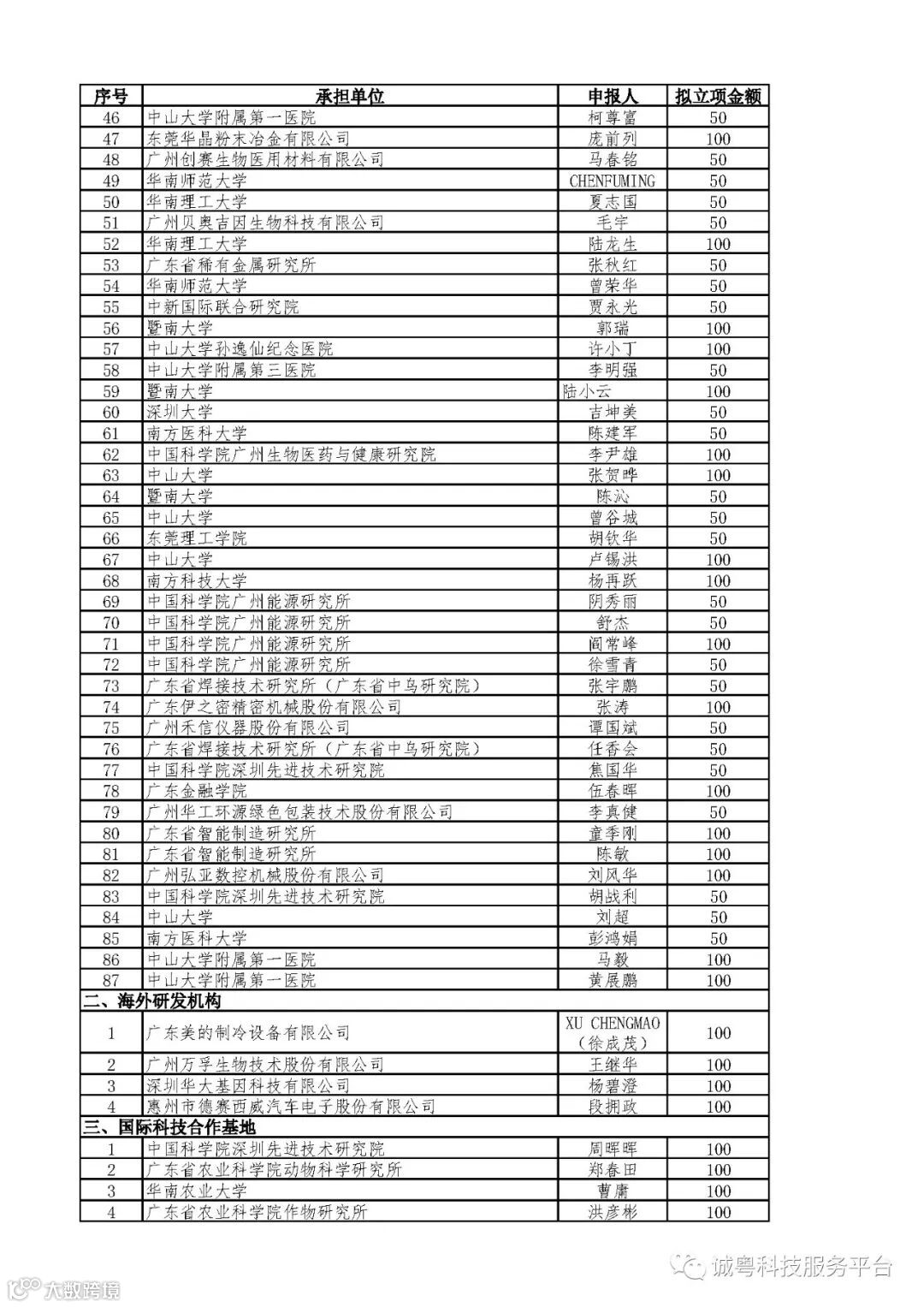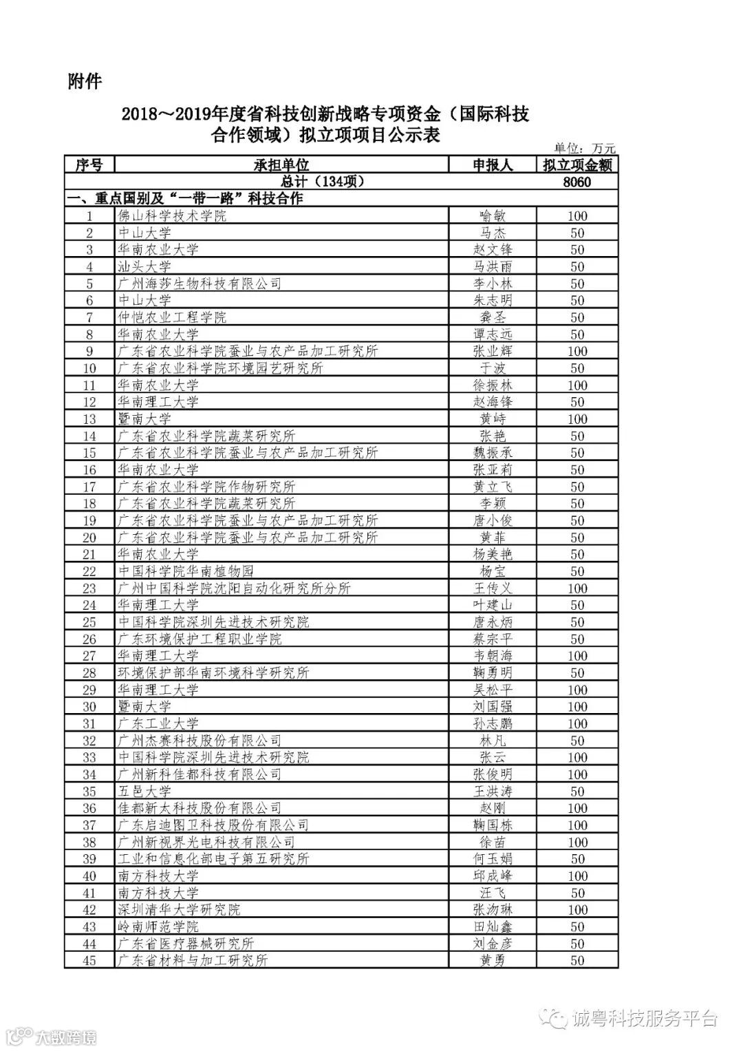 根据广东省省级财政专项资金管理办法等有关规定,拟安排2018~2019年度省科技创新战略专项资金(国际科技合作领域)项目资金,本批项目共134项,项目总资金8060万元。现在予以公示。公示期自12月7日~12月13日,共7天。