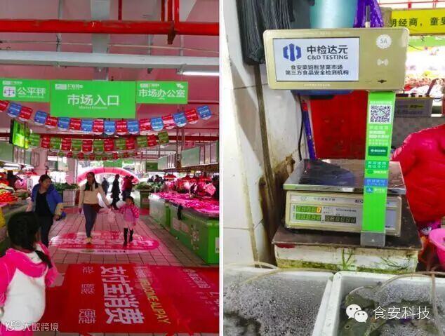 食品安全:智慧菜市场由中检达元负责的检测项目全面,有农药残留(蔬菜水果)、肉类水分(猪肉、牛肉、羊肉等)、瘦肉精(猪肉及其内脏)、二氧化硫(米粉、面粉、白糖、红枣、银耳、枸杞等)、吊白块(豆腐、豆泡等)、孔雀石绿(水产品)、亚硝酸盐(香肠、腊肉等肉制品及泡菜、酸菜等腌制品)、甲醛(水产品)。检测数据及时有效上传,上社菜市场电子显示屏显示的供应商提供的检测结果,智慧菜场正式运营之后,检测站的检测数据每周五会上报给市场经营者,再由市场经营者上报给天河区市场监督管理局,以后逐步把检测站的检测结果放上去。