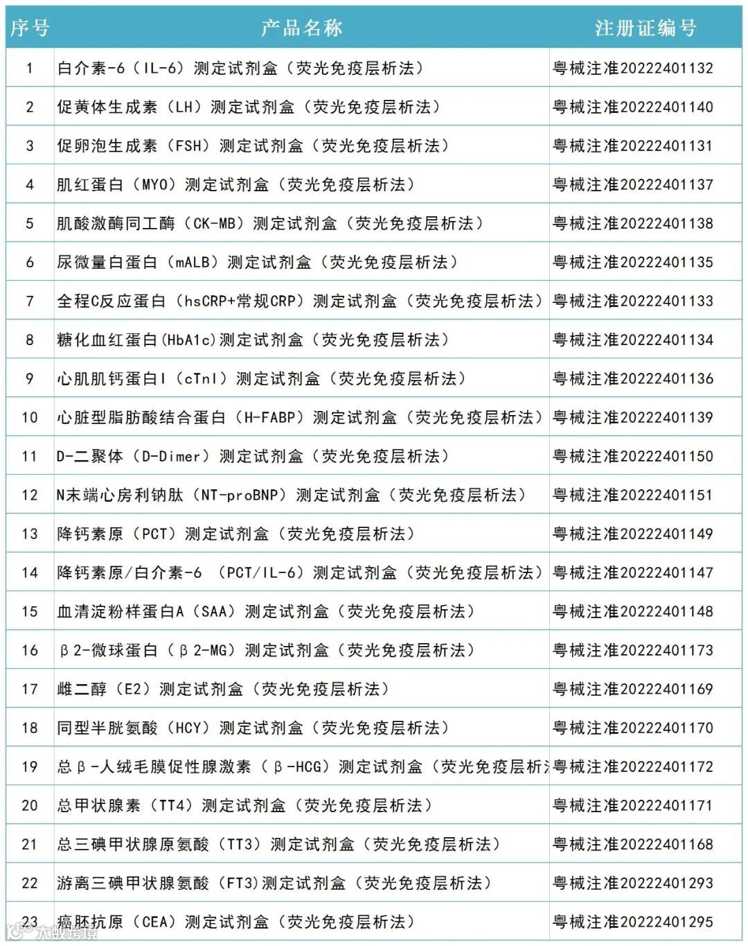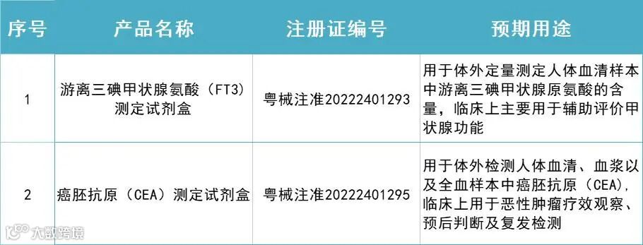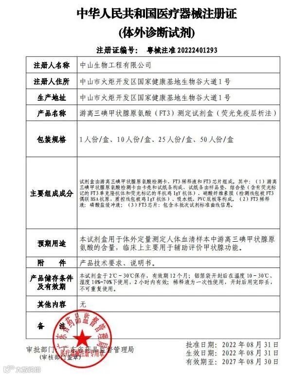 达安基因下属全资子公司中山生物工程有限公司,两项产品于2022年9月2日获广东省药品监督管理局颁发的《医疗器械注册证》。分别是游离三碘甲状腺氨酸(FT3)测定试剂盒(荧光免疫层析法)、癌胚抗原(CEA)测定试剂盒(荧光免疫层析法)。