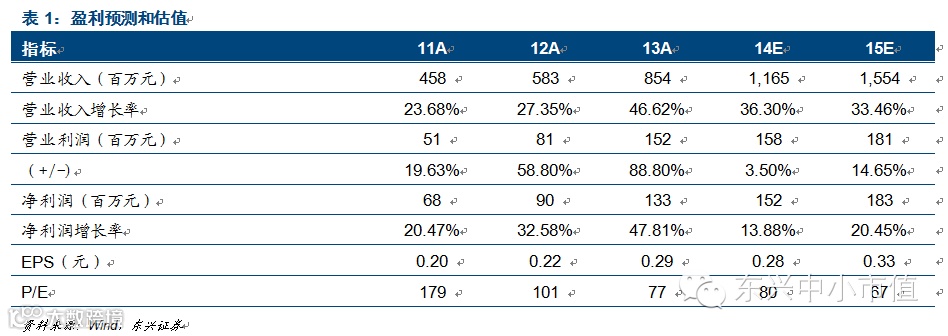 按照公司除权后总股本计算,我们预计公司14-15年每股收益分别为0.28元和0.33元,对应目前的动态PE分比为80倍和67倍。我们坚定看好公司的长期投资价值,继续给与“强烈推荐”的评级。