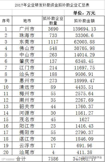 根据《关于激励企业研究开发财政补助试行方案》(粤财工〔2015〕59号)、《广东省省级企业研究开发财政补助资金管理办法(试行)》(粤财工〔2015〕246号)和《广东省企业研究开发省级财政补助政策操作指引(试行)》(粤科政字〔2015〕164号)有关规定,现将2017年企业研究开发补助资金拟支持项目予以公示,公示期为2017年12月7日- 12月13日,共7天。任何单位和个人如对公示内容持有异议,请在公示期内以书面形式向省科技厅、财政厅反映。反映公示名单的情况和问题应坚持实事求是原则,以个人名义反映情况的,请提供真实姓名、联系方式和反映事项证明材料等;以单位名义反映情况的,请提供单位真实名称(加盖公章)、联系人、联系方式和反映事项证明材料等。对收到的异议,我们将严格按照相关规定处理。