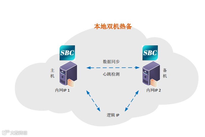 本地双机热备中主机与备机放置于同一机房,通过内网连接。此模式下主备机仅拥有一个对外的逻辑ip处理业务。提供实时的数据同步、主机状态心跳检测,使得主机宕机时,备机立即切换为主机并接管所有业务。同时昆石SBC还具备更完善的主备机切换,通话不中断功能,主机在数据同步的同时,也会将呼叫状态和媒体端口同步给备机,当备机启用时可以直接恢复业务,承接主机在异常时的所有通话业务,真正达到客户侧无感知。