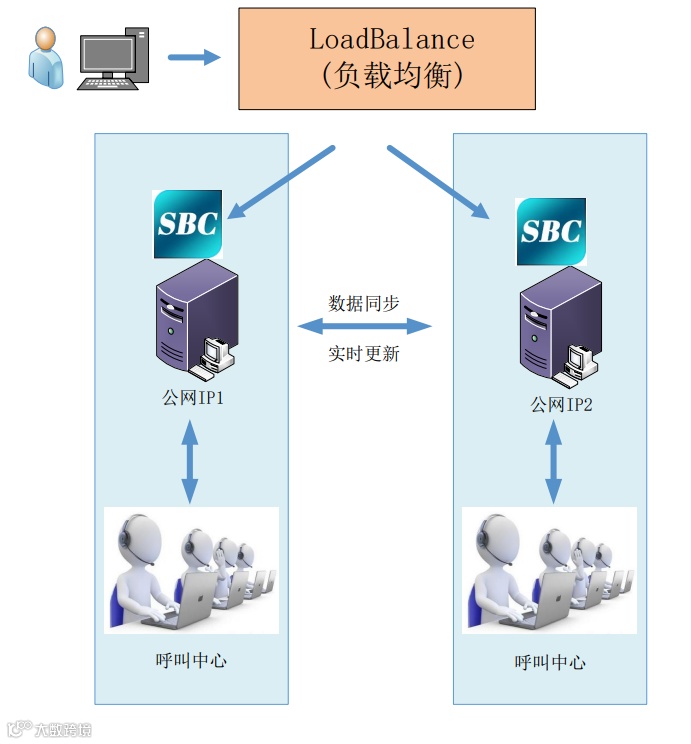 两台SBC服务器放置于不同机房,通过公网或虚拟专网连接,各自拥有独立的一个或多个IP地址。两台SBC可以同时对外提供服务,数据互为备份,互为容灾。