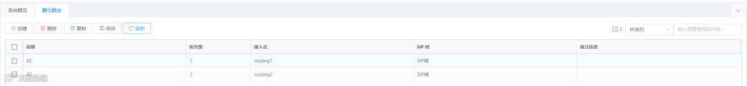 静态路由是昆石SBC基本的路由能力,通过前缀匹配进行会话路由的指定,支持根据优先级路由、提供备用路由能力。如可以设置相同前缀的2个路由,并设置优先级,routing2作为备用路由,会话首先会转发至routing1,当routing1无法对接时,可自动切换至routing2,无需手动切换路由,保障会话平稳进行。