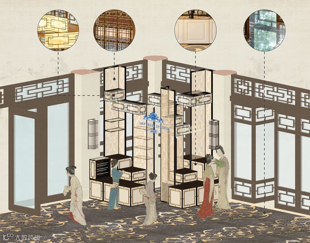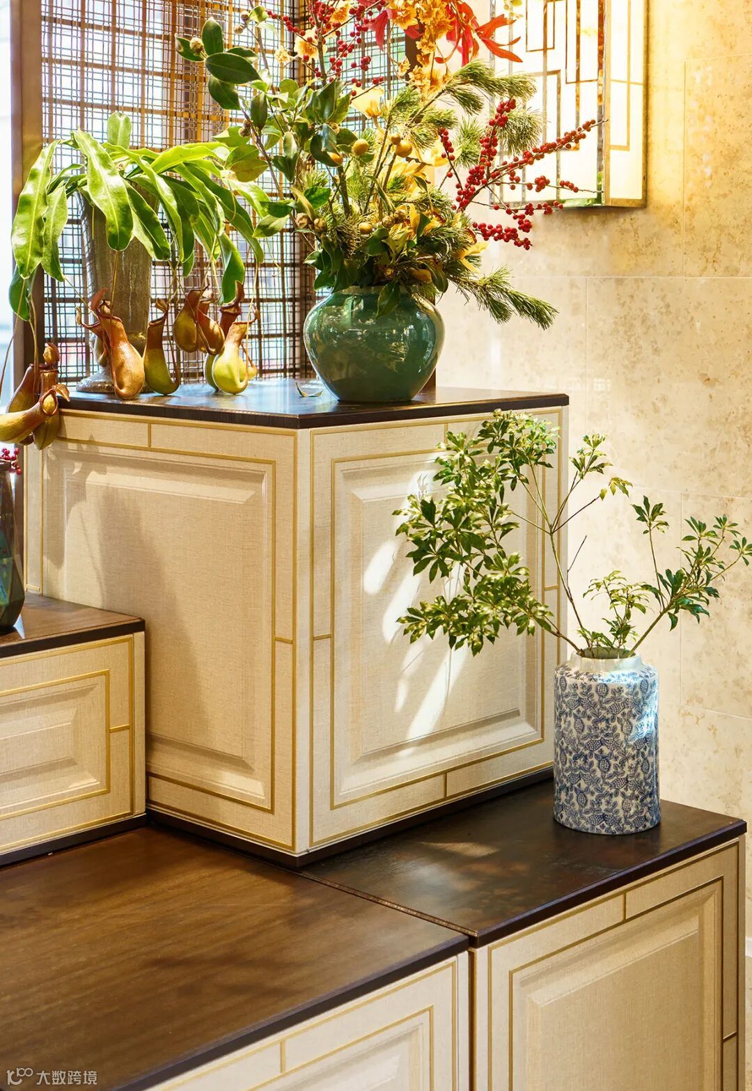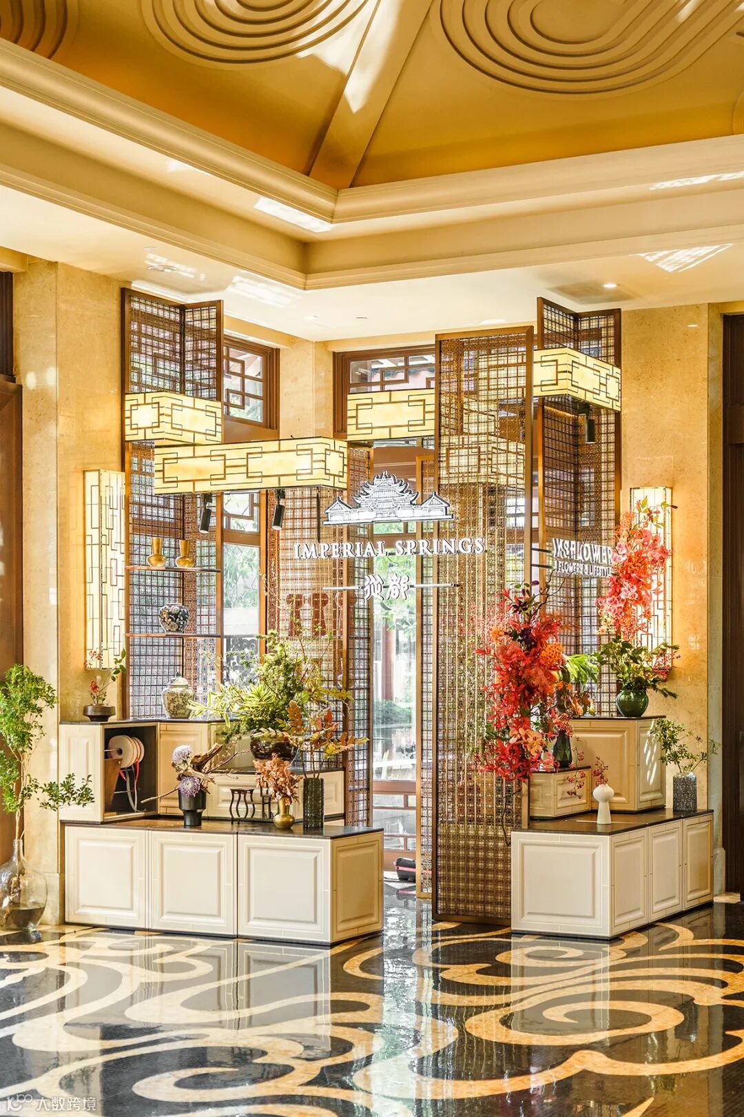 本案所诞生的装置,就是汲取从都国际庄园的设计,摈弃炫目,夸张的装饰语汇,借助东方美学,从奢华中寻觅与花艺融合的突破口,促成自在闲适的赏花意趣。