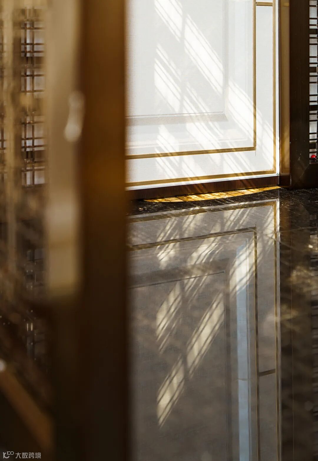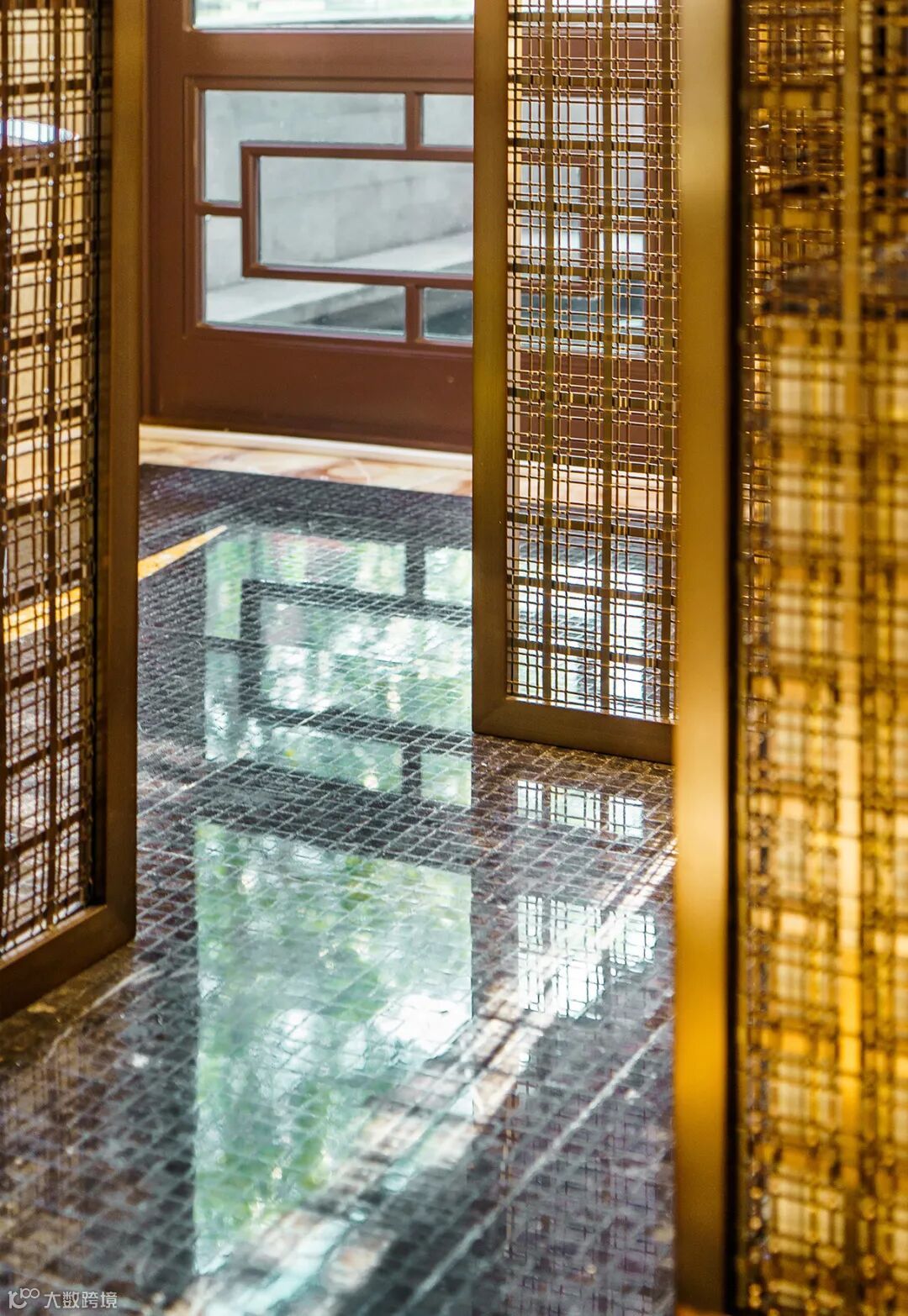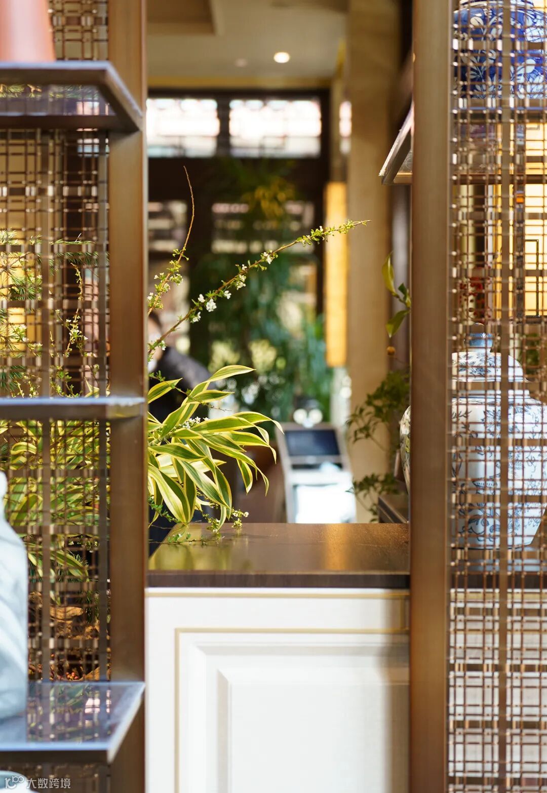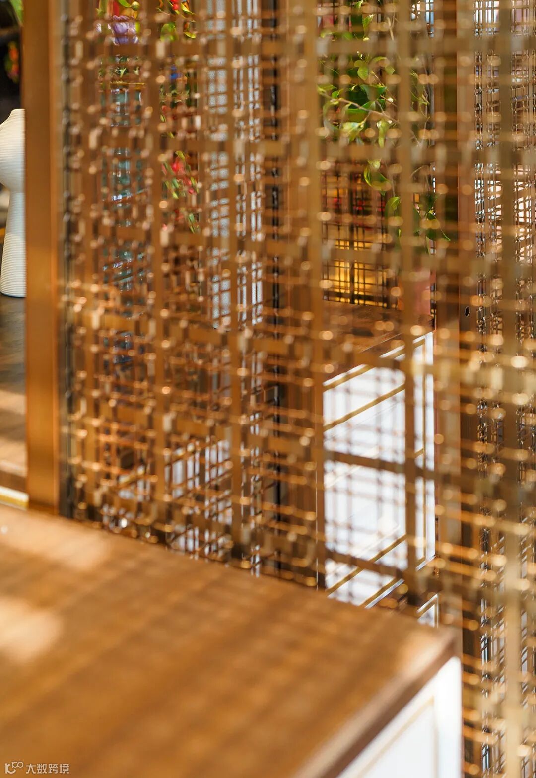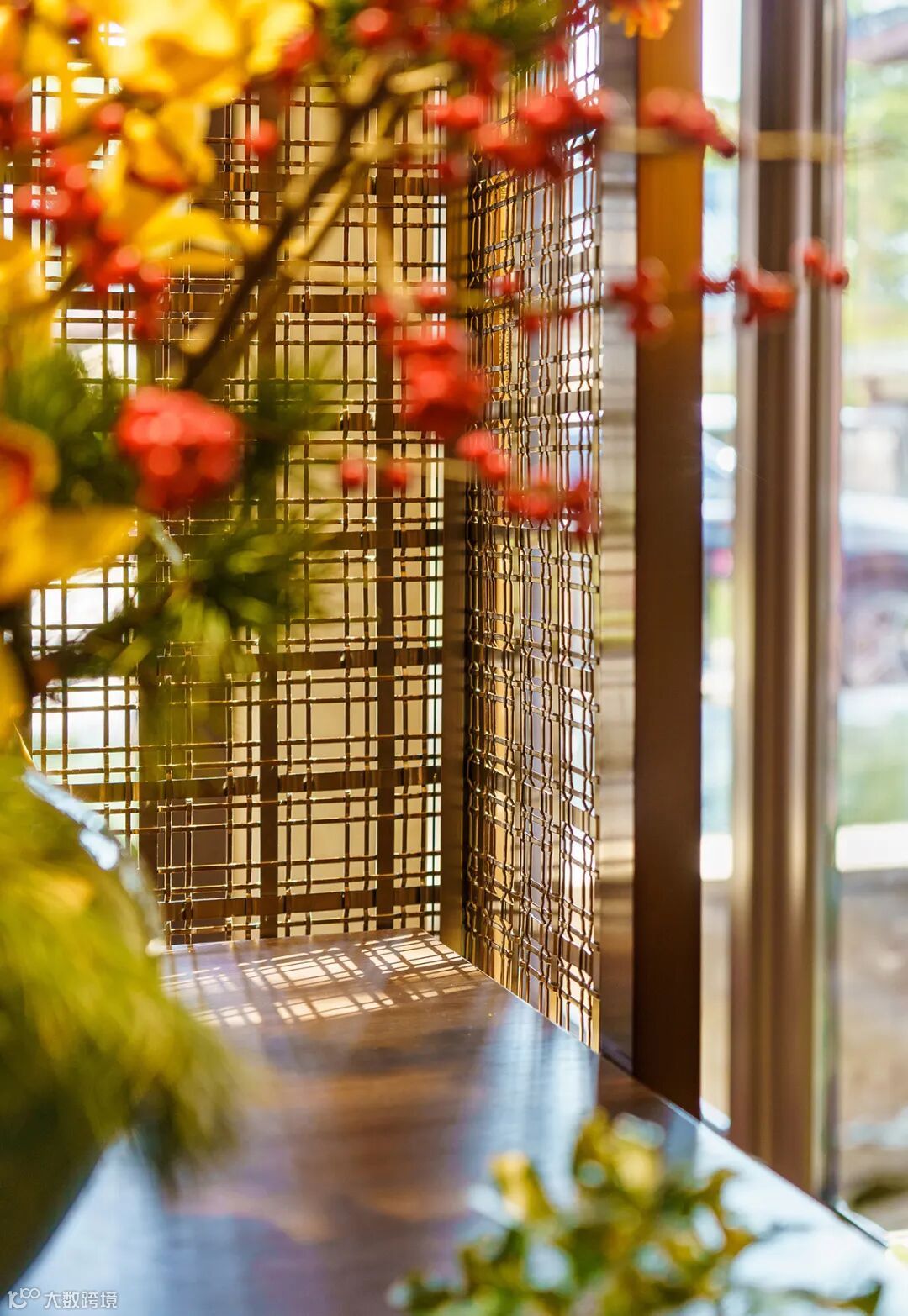 屏风使用金属镂空工艺,光影洗礼,光线穿过它的繁茂附着在现代花艺上,因应花型,枝叶的肌理形成斑驳的雕塑感。