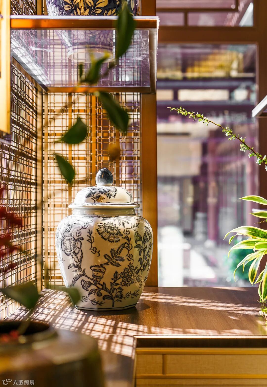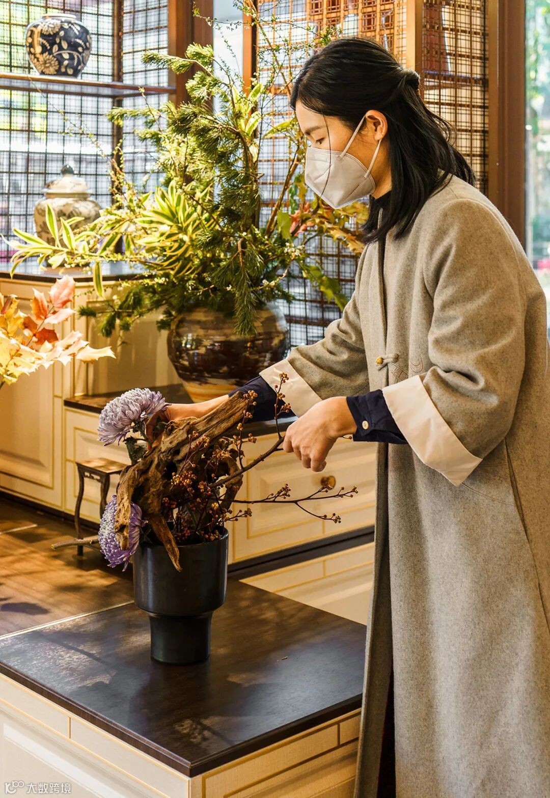 花艺是该空间的主角,设计师梳理好了主体,墙体玻璃与落地窗户外景间的空间逻辑,从花艺的摆放高度,到户内户外的照度系统,都进行了虚实结合,因借自然环境,与装置融为一体,让空间灵动仿似能自由透气,生机勃发。