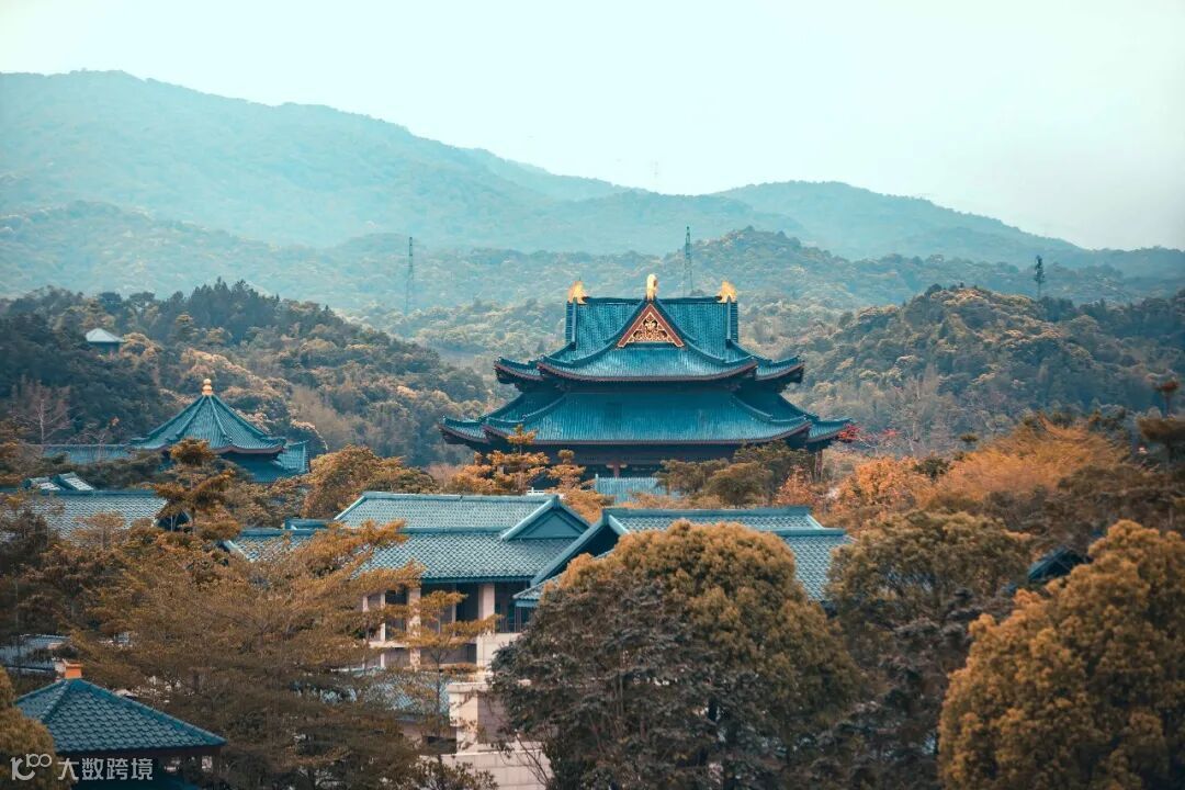 凭栏远眺,青碧色的屋檐嵌于山丘竹林之中