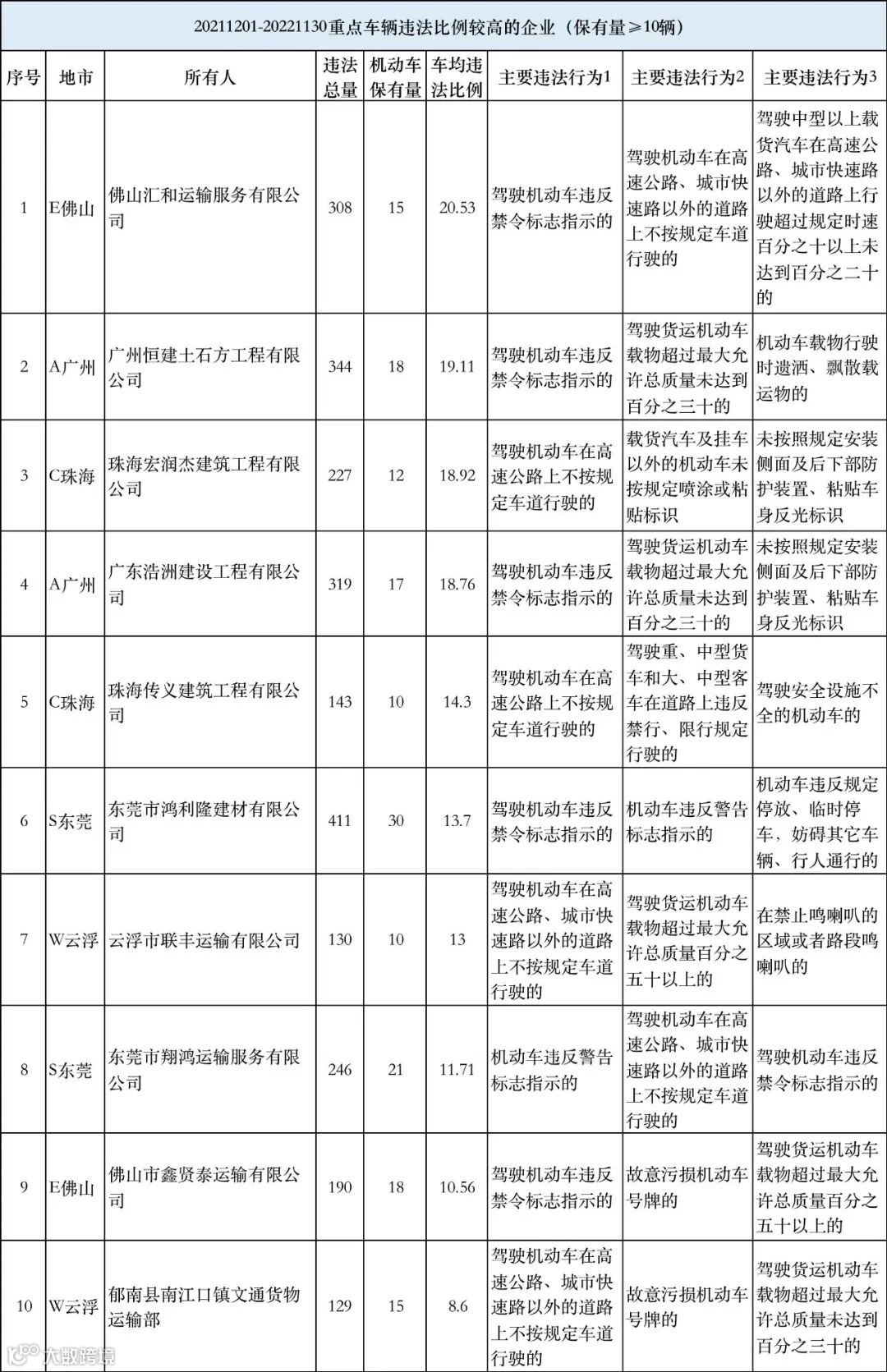 高风险运输企业包括佛山汇和运输服务有限公司、广州恒建土石方工程有限公司、珠海宏润杰建筑工程有限公司、广东浩洲建设工程有限公司、珠海传义建筑工程有限公司、东莞市鸿利隆建材有限公司、云浮市联丰运输有限公司、东莞市翔鸿运输服务有限公司、佛山市鑫贤泰运输有限公司、郁南县南江口镇文通货物运输部等10家违法比例较高的重点企业,其中佛山汇和运输服务有限公司车均违法比例达20.53次。