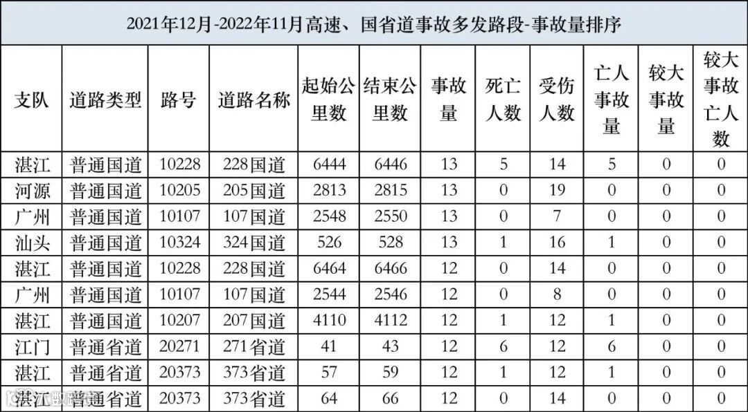 事故多发路段包括228国道湛江段、205国道河源段、107国道广州段等10处。对于这些事故多发路段,公安机关将协调交通、应急等部门深入排查分析原因,全力消除道路安全隐患。