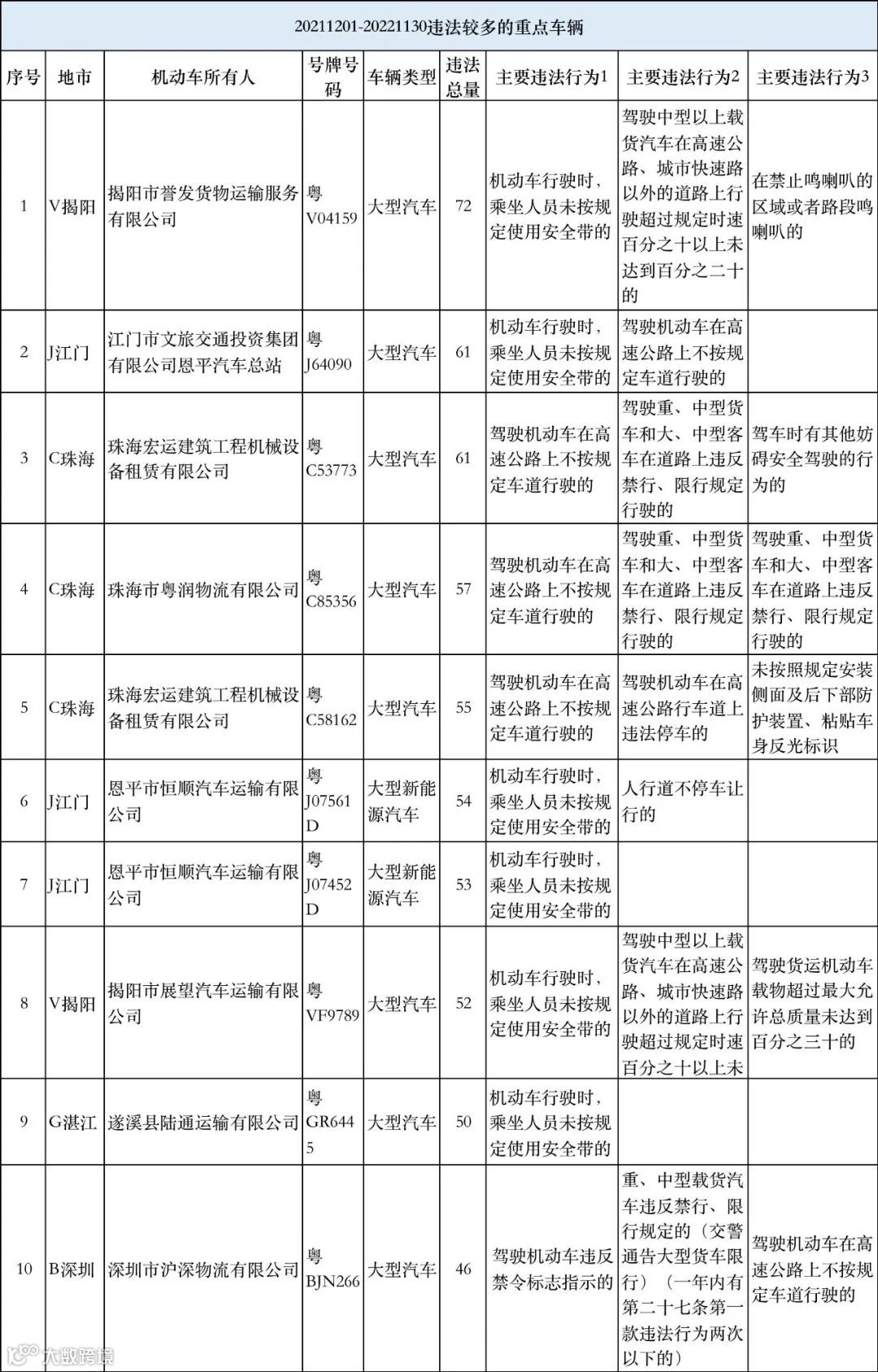 违法较多的重点车辆包括揭阳市誉发货物运输服务有限公司的粤V04159大型汽车、江门市文旅交通投资集团有限公司恩平汽车总站的粤J64090大型汽车、珠海宏运建筑工程机械设备租赁有限公司的粤C53773大型汽车、珠海市粤润物流有限公司的粤C85356大型汽车、珠海宏运建筑工程机械设备租赁有限公司的粤C58162大型汽车、恩平市恒顺汽车运输有限公司的粤J07561D大型新能源汽车、恩平市恒顺汽车运输有限公司的粤J07452D大型新能源汽车、揭阳市展望汽车运输有限公司的粤VF9789大型汽车、遂溪县陆通运输有限公司的粤GR6445大型汽车、深圳市沪深物流有限公司的粤BJN266大型汽车。