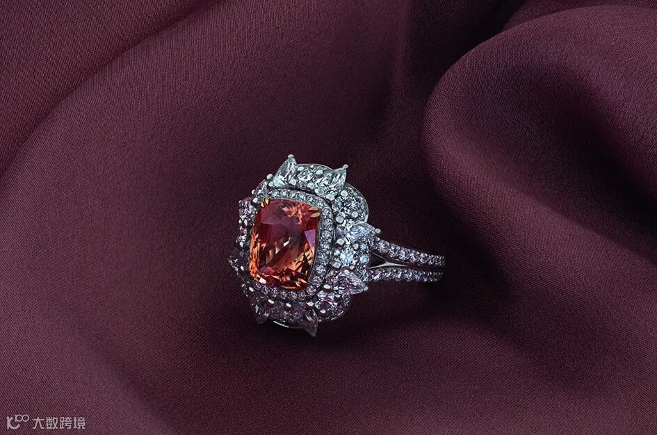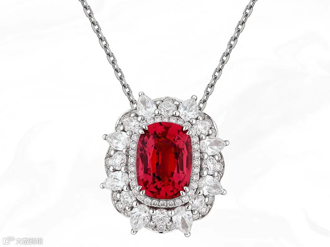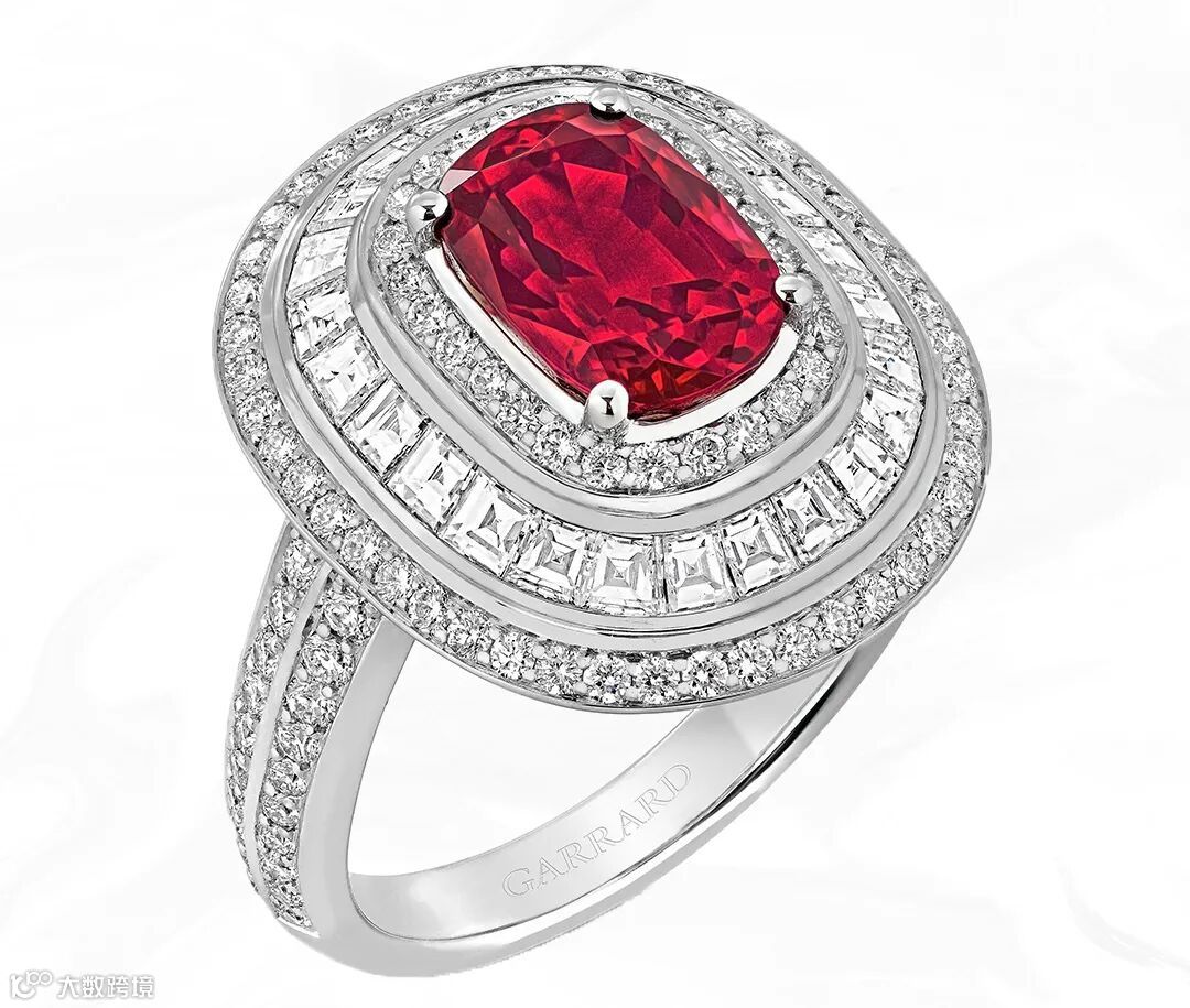这枚优雅的红宝石戒指上,镶嵌着2.83克拉缅甸椭圆形红宝石,展现出鸽血红中极为珍贵的“比红色更红”的色调,每颗钻石都被精确地切割,让宝石的边镶光滑对称。而枕形切割宝石与圆形宝石一样经典,特有的曲线美和更具现代感的轮廓,注定是一款传世之作。