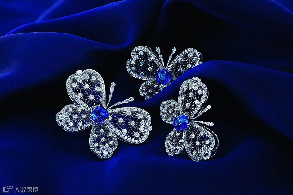 蓝宝石和钻石蝴蝶胸针拥有着精美花丝镶嵌翅膀,造型优雅。其中花丝镶嵌是一种古老的手工技艺,Garrard的专业工匠精心制作出发丝般纤细的金线,组合成细腻的花丝网,栩栩如生地表现出蝴蝶优雅翅膀的娇柔美感,并将闪耀的钻石镶嵌其上,展现出丰富的色彩与深层次的美感。
