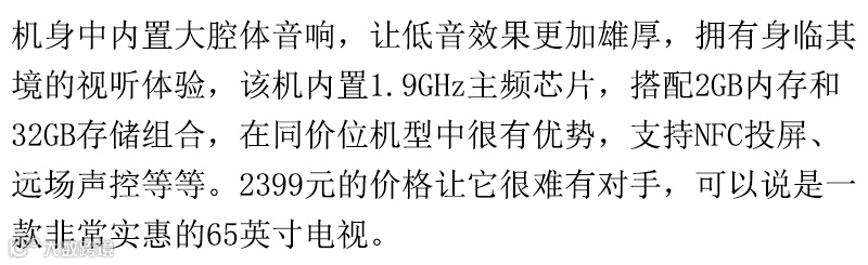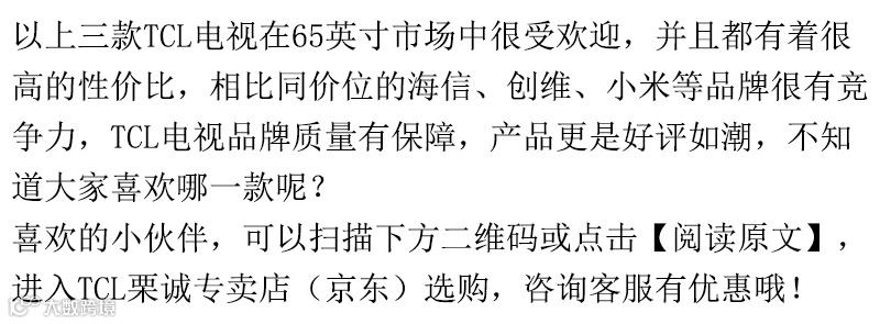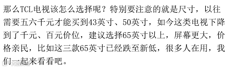 导读:如今这类电视下降到了千元、百元价位,建议选择65英寸以上,屏幕更大,价格亲民,比如这三款65英寸已经跌至新低,很多人在用,我们一起来看看吧。