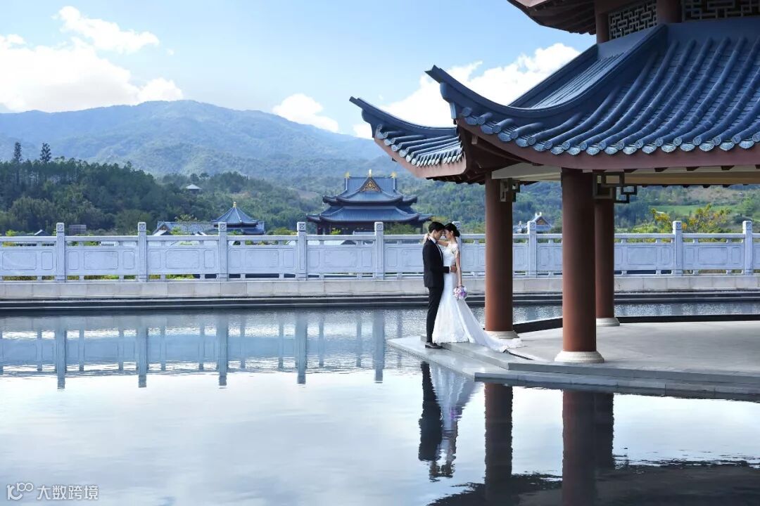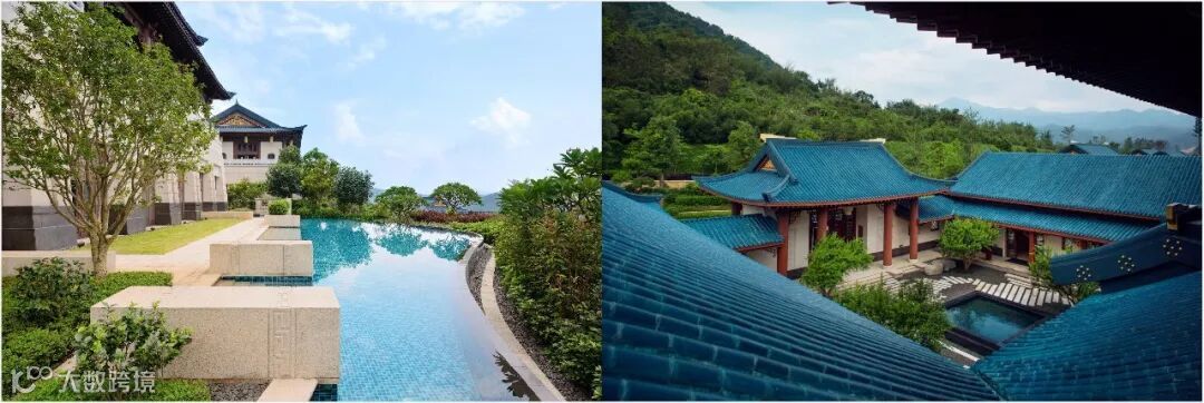 而伴随着《结婚进行曲》,新人缓缓穿过凤凰官邸的大门,进入庭院,白色婚纱随风飘动,华美的证婚仪式将正式开启。新人身后是远山和草木,黛蓝色的建筑和蜿蜒的溪流……“我愿意”的承诺在这样天地交融的空间内都显得格外庄重。