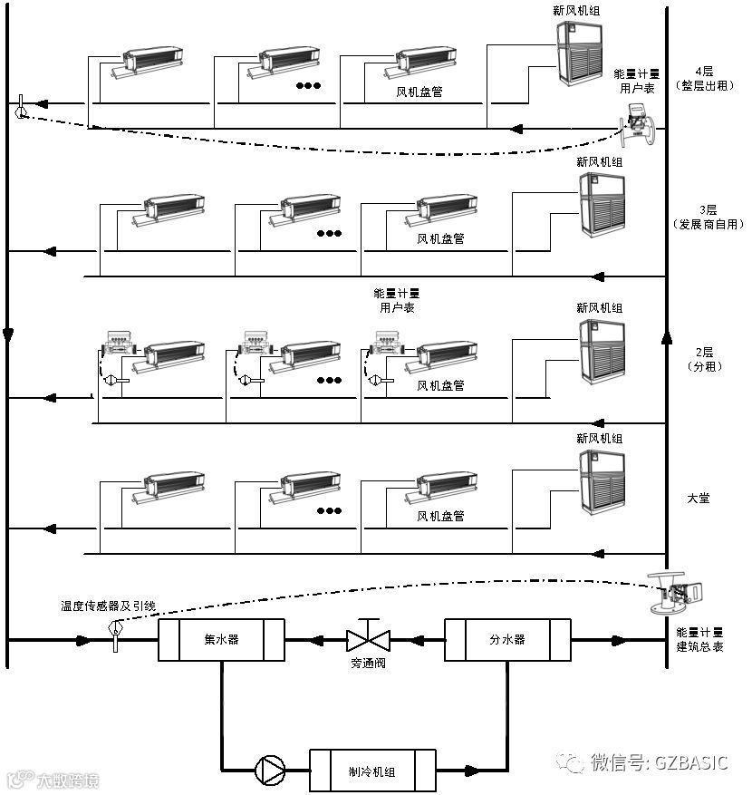 写字楼大堂安装了能量计量分摊表,负责本层各个末端设备的冷量消耗的计量。能量计量分摊表的读数可以作为整个大楼各个用户空调冷量直接分摊的依据。