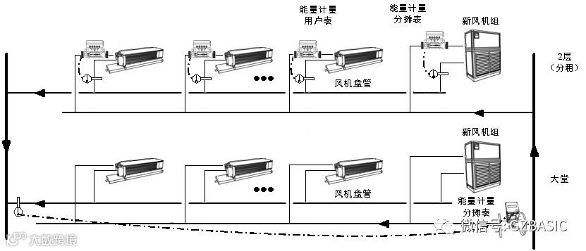 直接分摊是采用给公共区域的中央空调设备直接安装冷热量计量表的方式,直接计量相应的公共区域中央空调冷量的消耗,并将公共区域消耗量按照该区域各个用户自身中央空调冷量的消耗量比例进行摊分。这种做法是各个公共区域按照各自的使用情况,有不同的分摊量。而且,分摊量能够计量。直接分摊的前期计量设备投资相对较高。如下图,楼层新风机组安装了能量计量分摊表,负责本层各个风机盘管的新风供给。因此,能量计量分摊表的读数可以作为本楼层各个用户用于空调冷量明摊的依据。