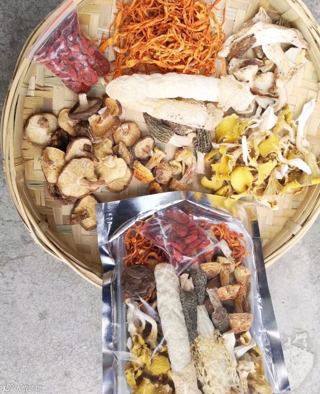 精选虫草花,鸡油菌,羊肚菌,野生香菇,野生牛肝菌,上等姬松茸,竹荪,红枣,枸杞等。