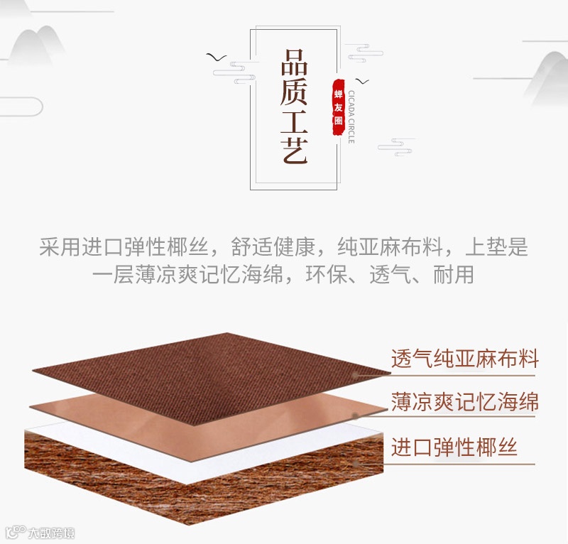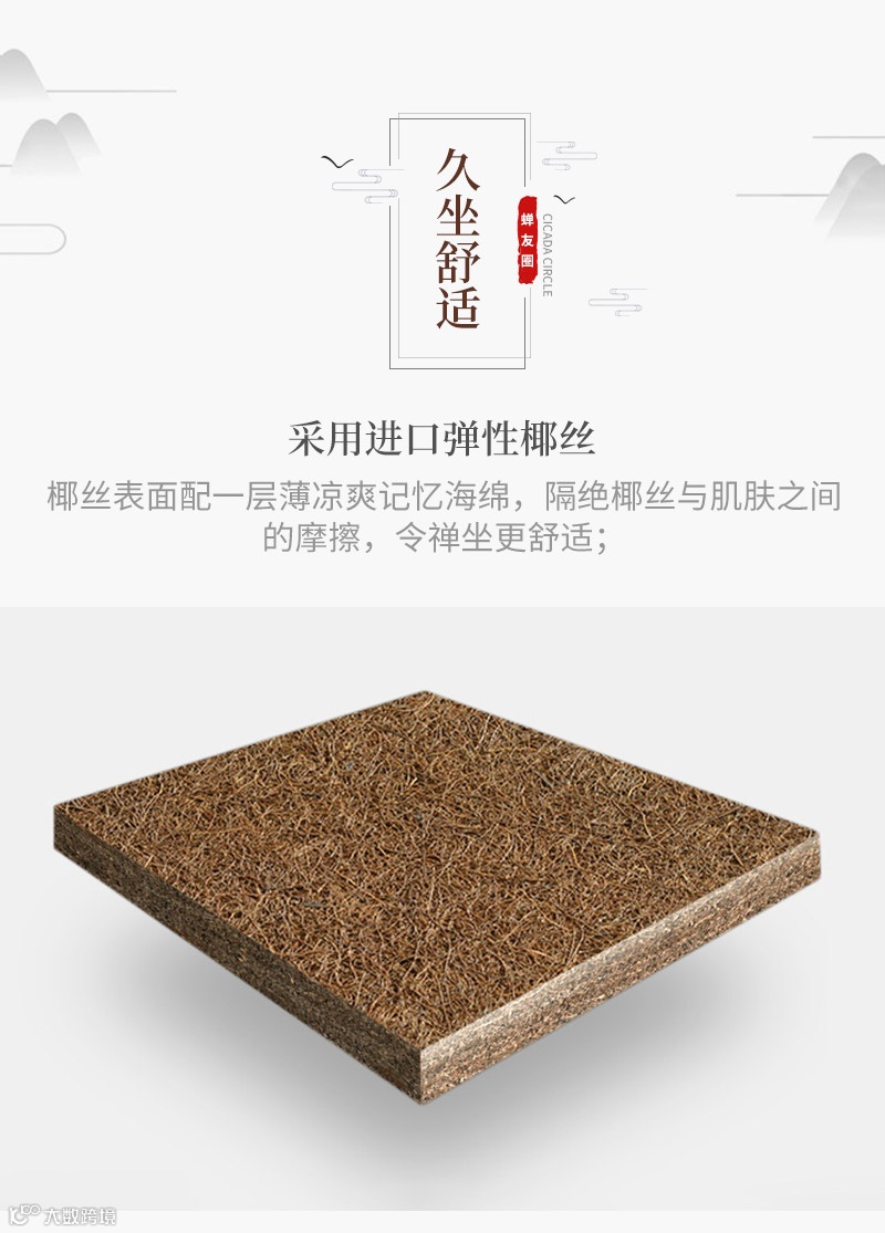 3、椰丝表面配一层薄凉爽记忆海绵,隔绝椰丝与肌肤之间的摩擦,令禅坐更舒适。