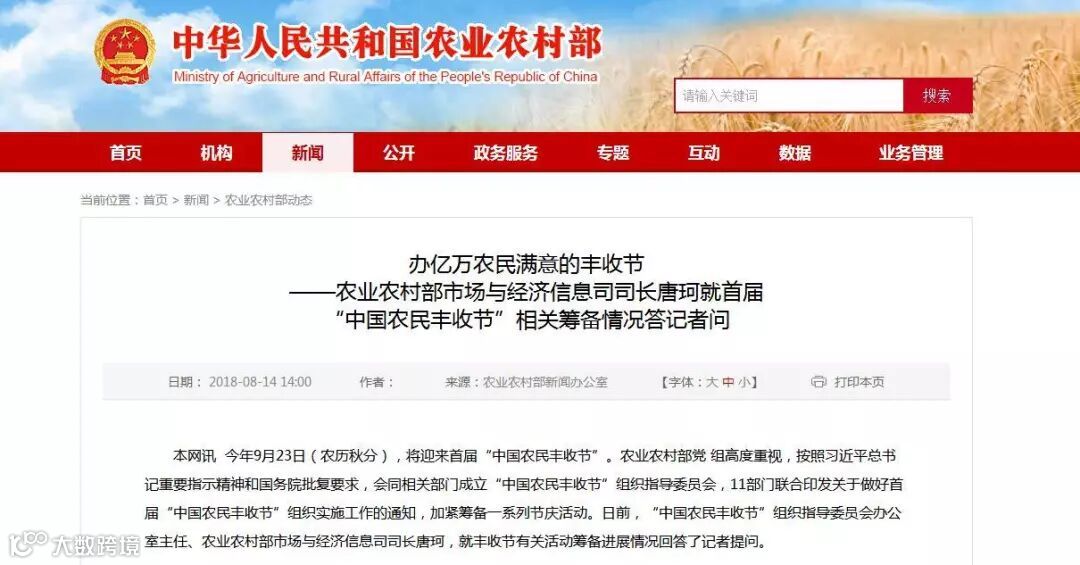 中央农办、农业农村部等 11 部门联合印发了关于做好首届“中国农民丰收节”组织实施工作的通知,明确了指导思想、基本原则、重点活动等内容;