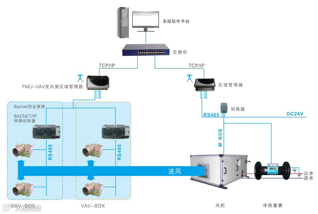 FMU-VAV-B是专用于BACnet变风量空调(VAV)系统的变风量区域管理器,通过以太网和BACnet通信协连接VAV系统中的VAV网络控制器(例如江森NCE/NAE等),读取VAV网络控制器所管理的VAV BOX的瞬间风量、楼层AHU空气处理机的送风温度,在FMU-VAV-B内部进行风量实时累积,从而实现长时间不间断的VAV风量累积。