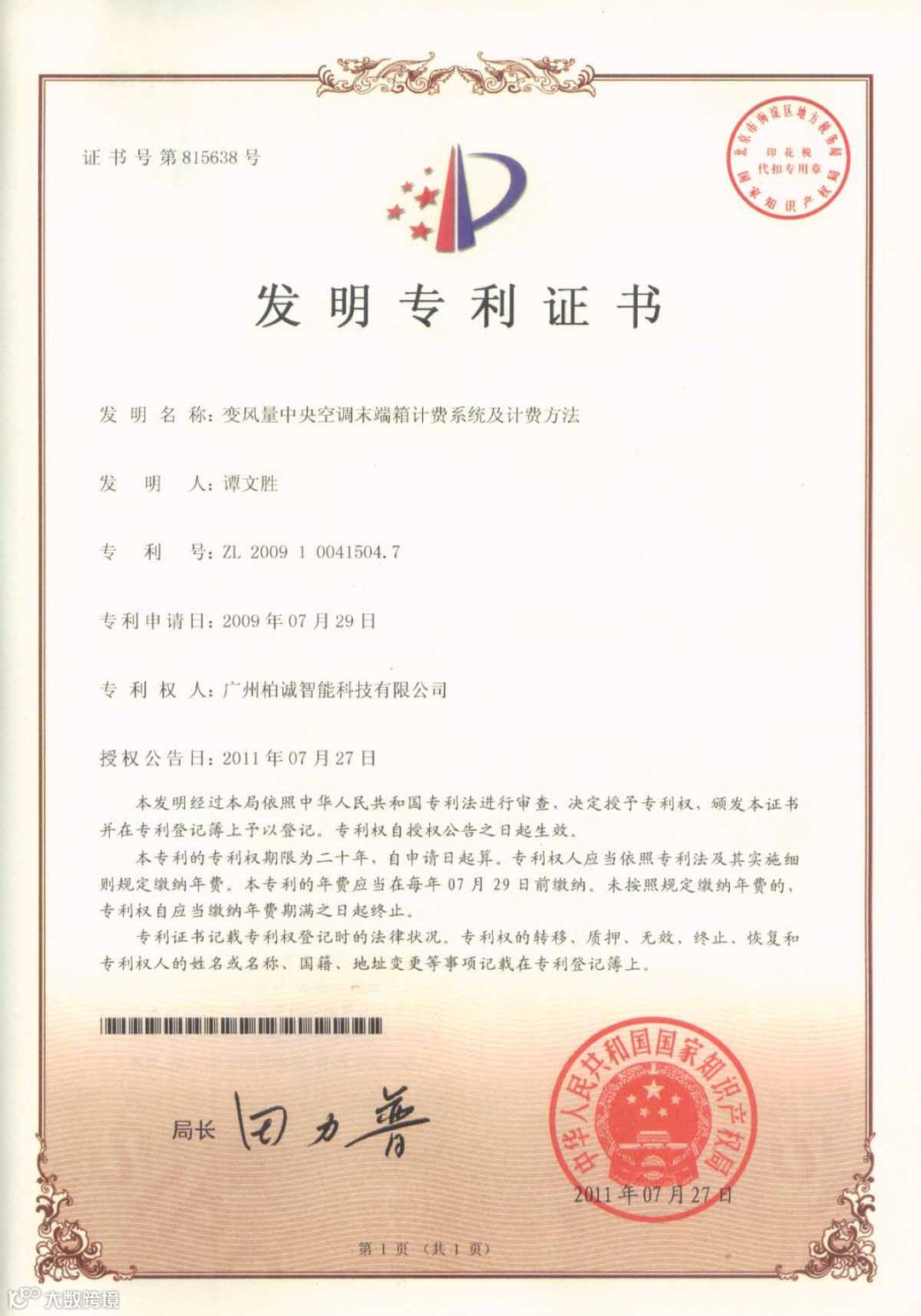07 广州柏诚《变风量中央空调计费系统及计费方法》发明专利证书