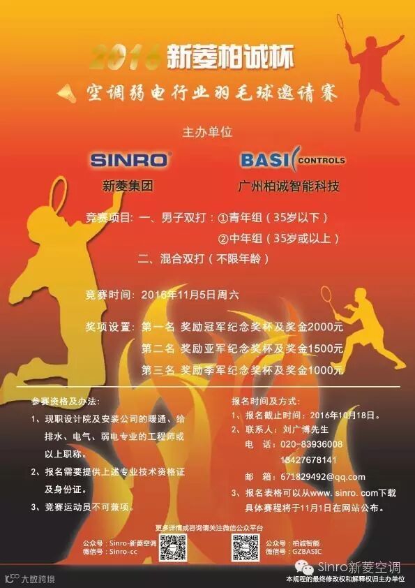 由新菱集团和广州柏诚智能科技联合主办的”2016新菱柏诚杯“空调弱电行业羽毛球邀请赛(广州赛区)现在开始接受报名了!我们诚邀业内羽毛球爱好者踊跃参加,精英荟萃,各展风采!