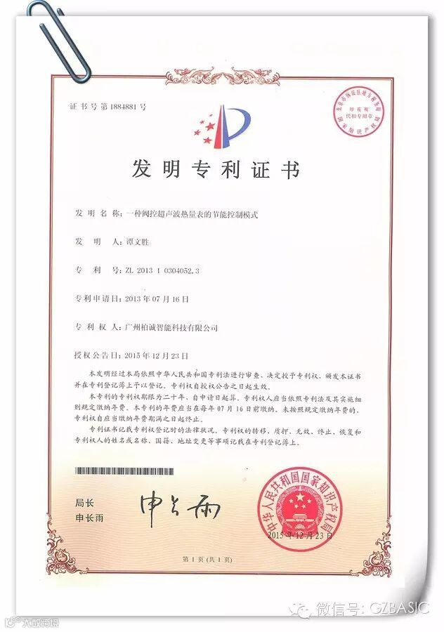 柏诚智能作为国内率先进行中央空调计量和供热计量的企业之一,一直致力于技术革新、产品创新。18年以来不断的提升产品与革新技术,为民族企业做大做强的坚实基础。近日,柏诚智能的“阀控超声波热量表的节能控制模式”,历经三年严格审查, 荣获国家发明专利授权(发明专利号:ZL2013 1 0304052.3),再次证明了柏诚智能的创新研发实力!