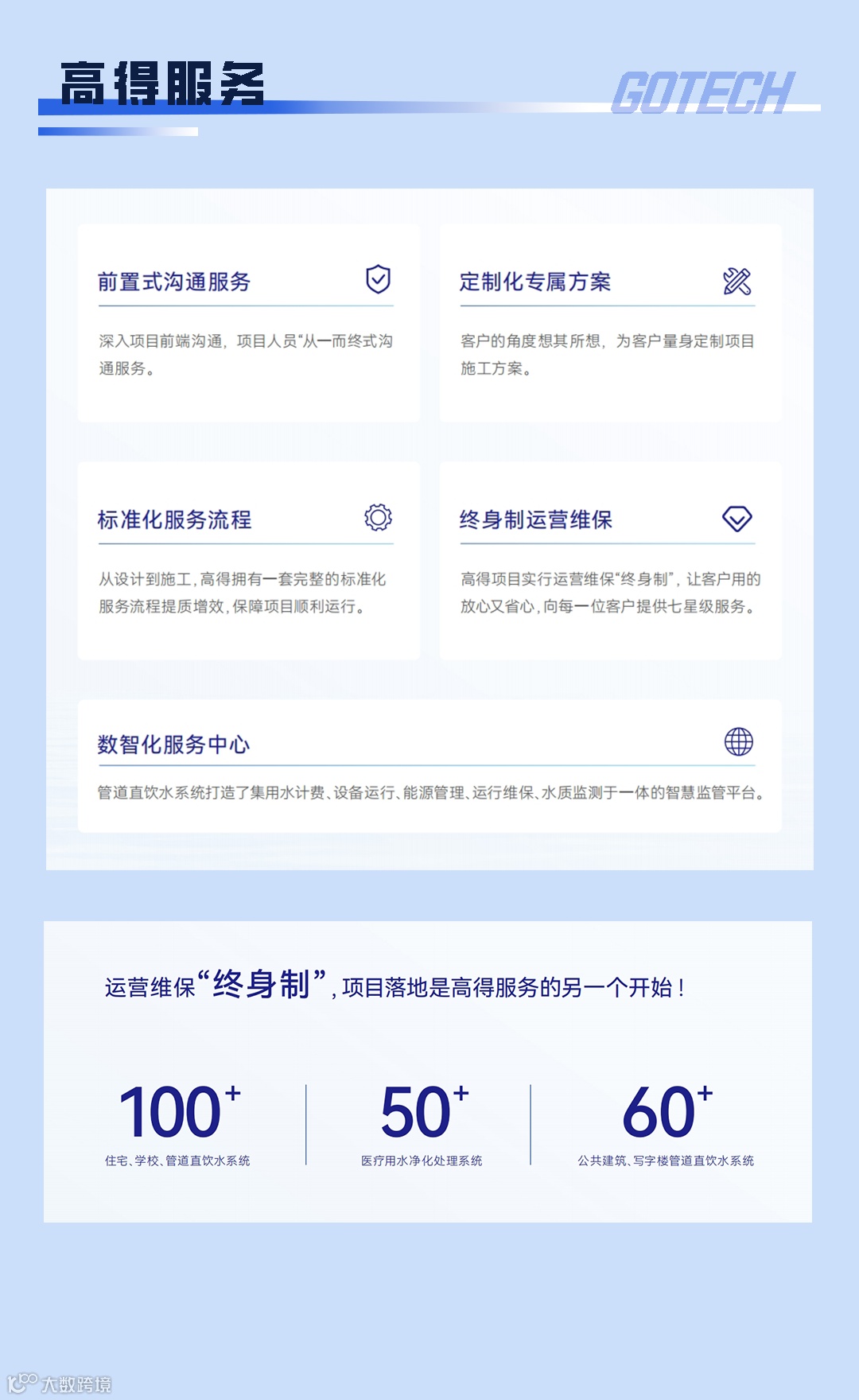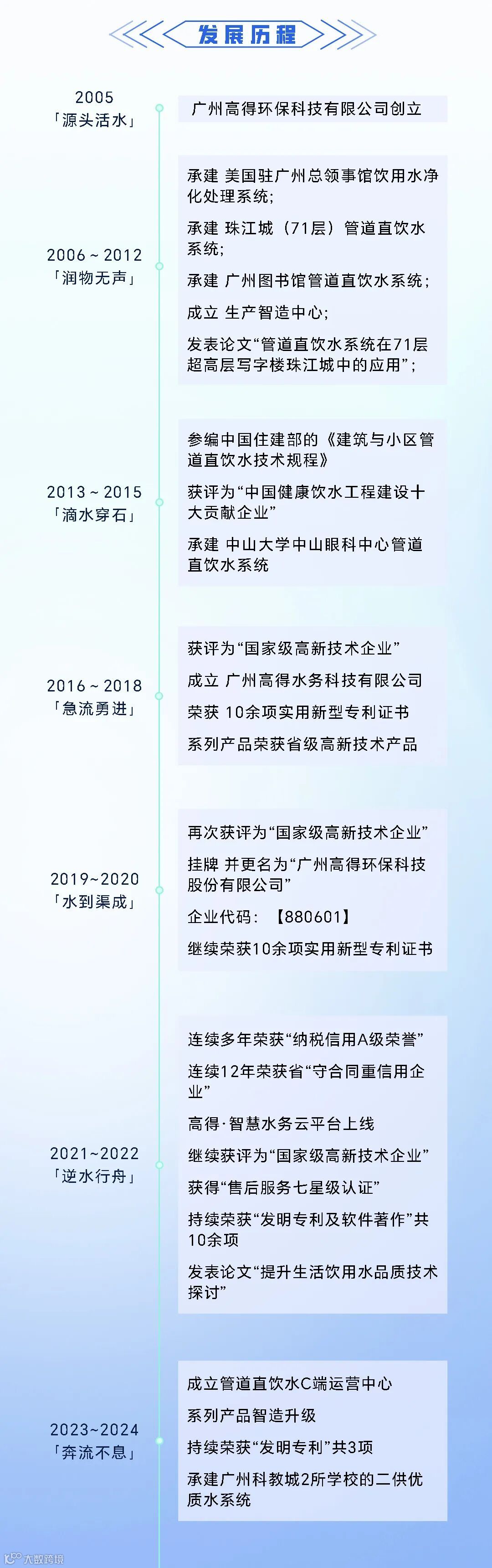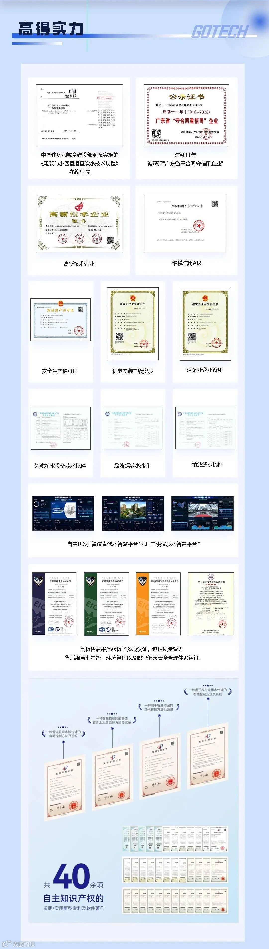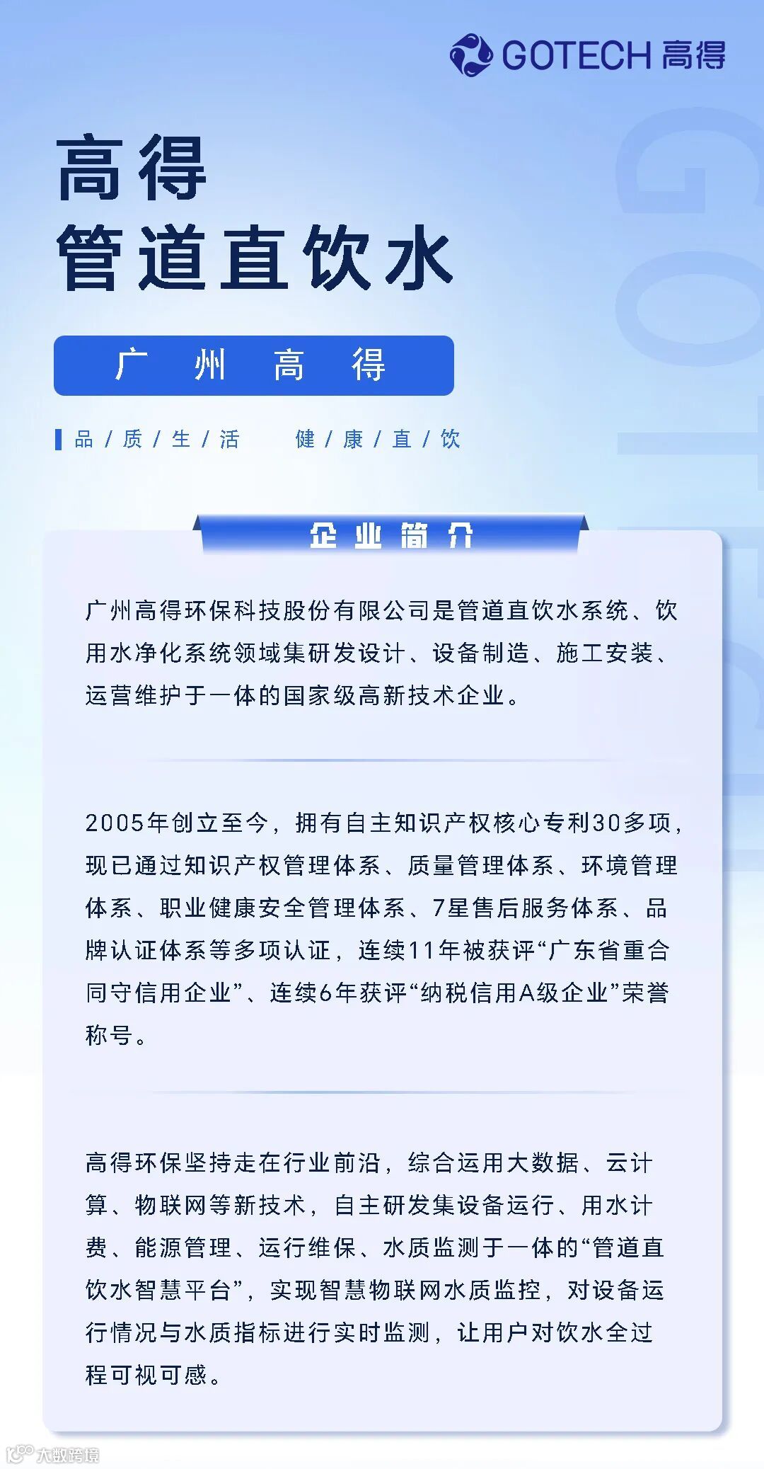 广州高得环保科技股份有限公司是管道直饮水系统、饮用水净化系统领域集研发设计、设备制造、施工安装、运营维护于一体的国家级高新技术企业。