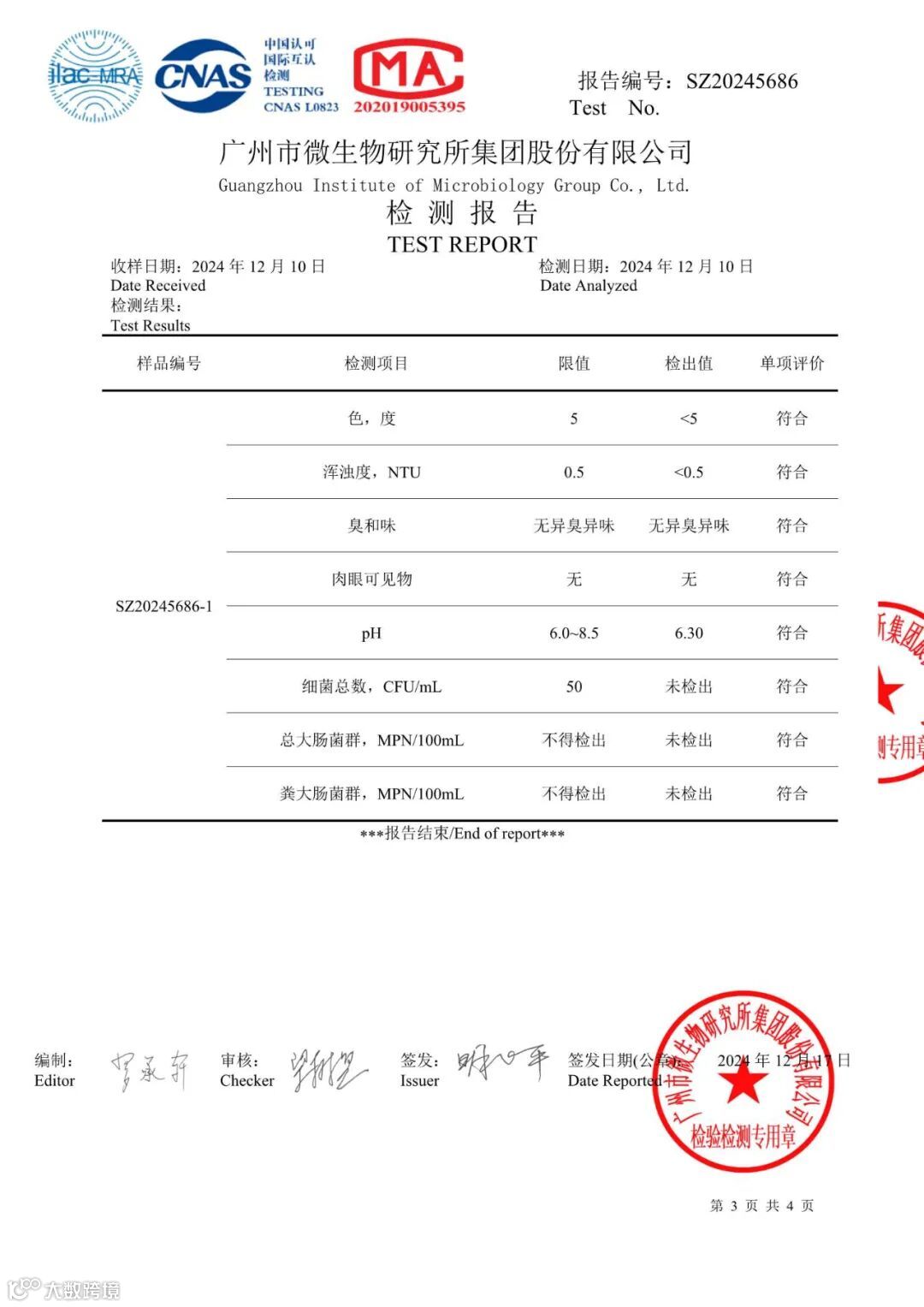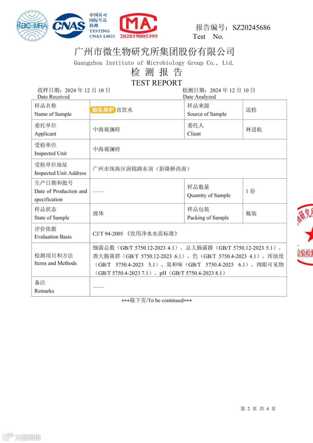 水质检测标准为CJ94-2005《饮用净水水质标准》,检测项目包含细菌总数,总大肠菌群,粪大肠菌群,色度,浑浊度,臭和味,肉眼可见物,pH值,本季度采取终端出水口水样全部检测合格,业主可以安心使用。