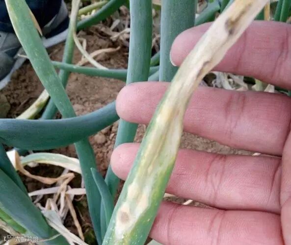 答:干尖从上到下,还有灰色煤层(部分感染紫斑病),葱管上有白点,主要是疫病感染引起的干尖白头。建议综合防治,可以用43%戊唑醇(40%苯醚、75%戊唑醇肟菌酯等)+60%烯酰嘧菌酯(或50%烯酰吗啉霜脲氰、72%霜脲·锰锌、69%烯酰吗啉锰锌、50%氰霜唑等)药剂配合使用,发白严重的建议配合含海藻酸或中微量元素的叶面肥使用。
