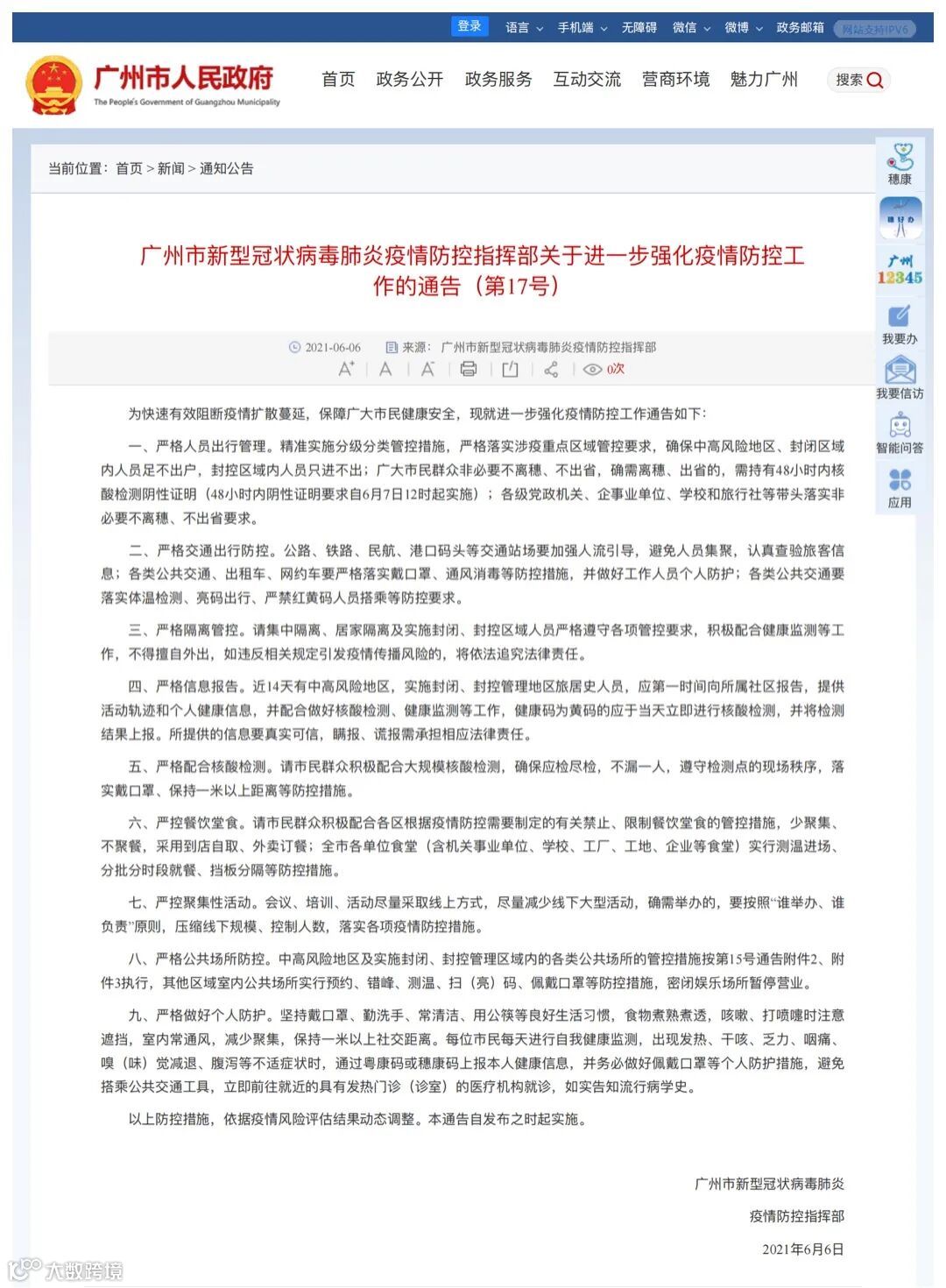 回答:这句话里的“离穗、出省”,包括了两层意思:一是通过广州辖区内机场、铁路、公路客运站等站场离穗的旅客(不含外地中转旅客),须凭“健康码”绿码,并持有48小时内核酸检测阴性证明;二是离穗出省的小型汽车司乘人员,须持有48小时内核酸检测阴性证明,以备查验。与14号通告的政策是一致的。