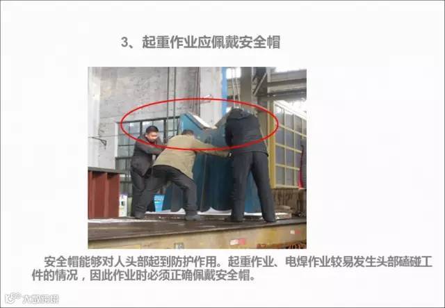 违章行为:吊装作业时站在吊物下方;或靠近起吊设备3米范围内及其运动趋势方向,或将身体任何部位探入其中。处于机械设备运转区域。装卸车及抬运作业人员时站在工作区域,或视野盲区