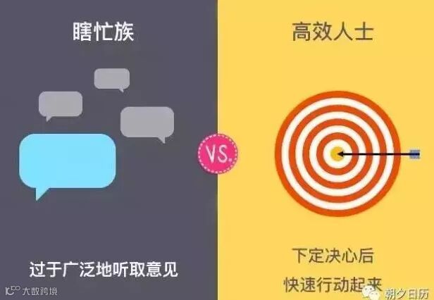 缺乏决断力是瞎忙族的通病,做事害怕犯错,行动时畏首畏尾。为了让所有人满意,过于广泛地甚至是毫无必要地征求意见,结果必然是众口难调,导致更加难以决策。