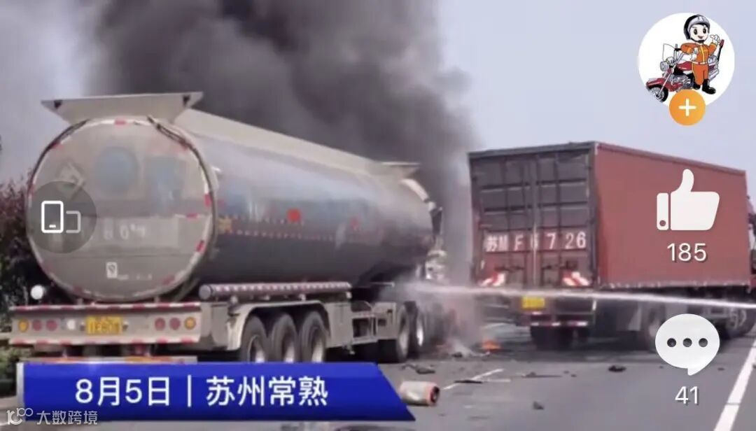 8月5号下午2点左右,苏州市消防救援支队常熟大队接到报警称,沪武高速常熟市梅李段有多车追尾起火,有1人被困。消防队员到达现场后,发现共有4辆车连环相撞,其中小轿车追尾后起火,驾驶员被困,火势又引燃后方槽罐车车头。救出后,消防员还脱下救援服为伤者遮阳、喂水和擦拭身体降温。让人担心的是,槽罐车内还装载着30吨润滑油。经过消防队员约30分钟救援,大火被完全扑灭,槽罐车得以保全。